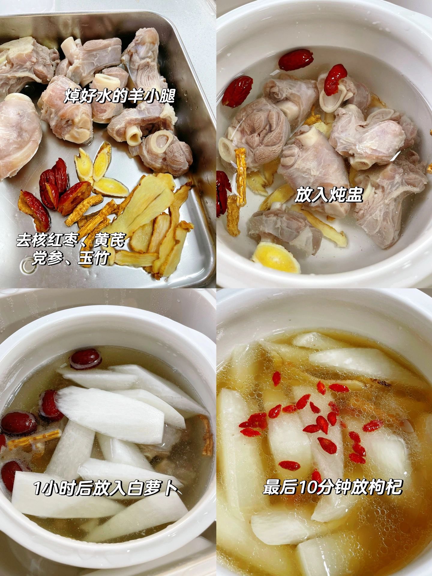 羊小腿块泡1小时除去血水,放入生姜、葱段焯水,水开后用少量米酒帮助撇去浮沫。温水洗净后,加入炖料,炖1小时放入白萝卜。