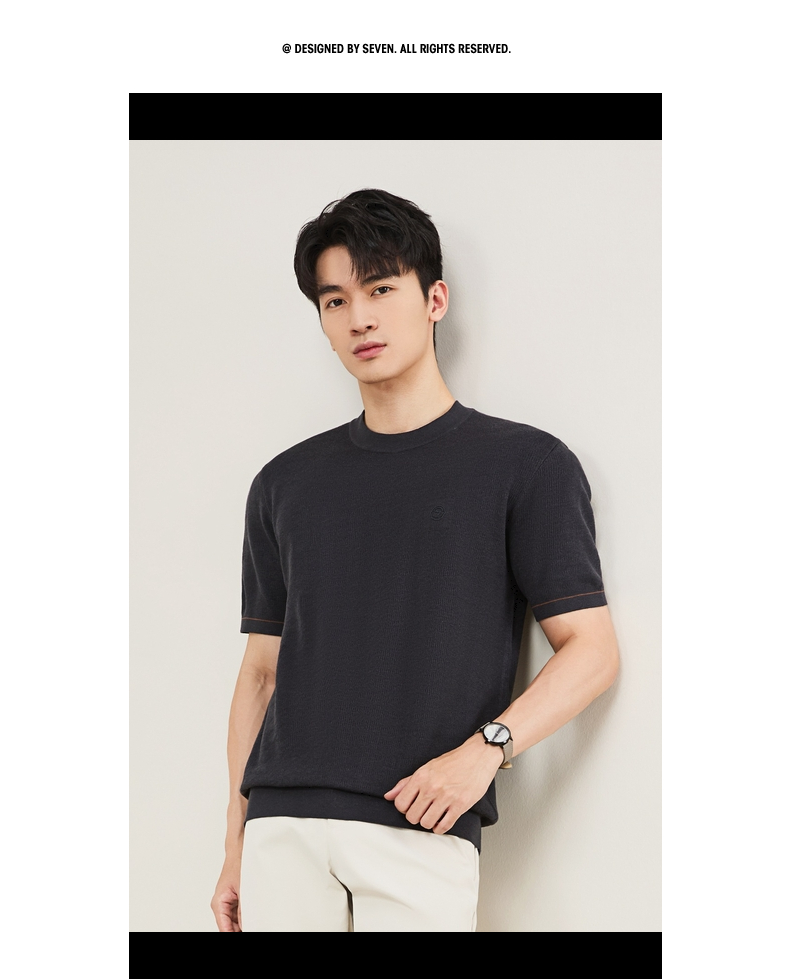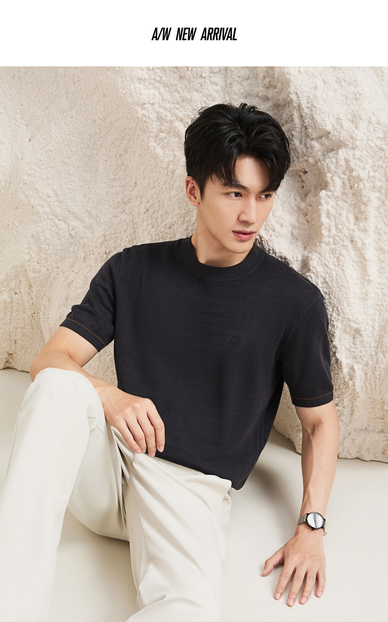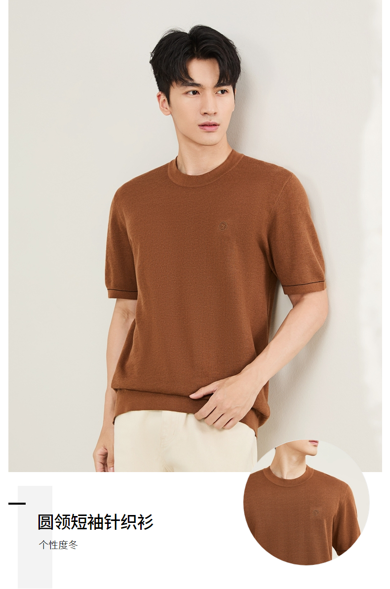 【含羊绒/短袖针织衫】柒牌男装圆领短袖百搭舒适圆领提花套头薄毛衫129Y70640