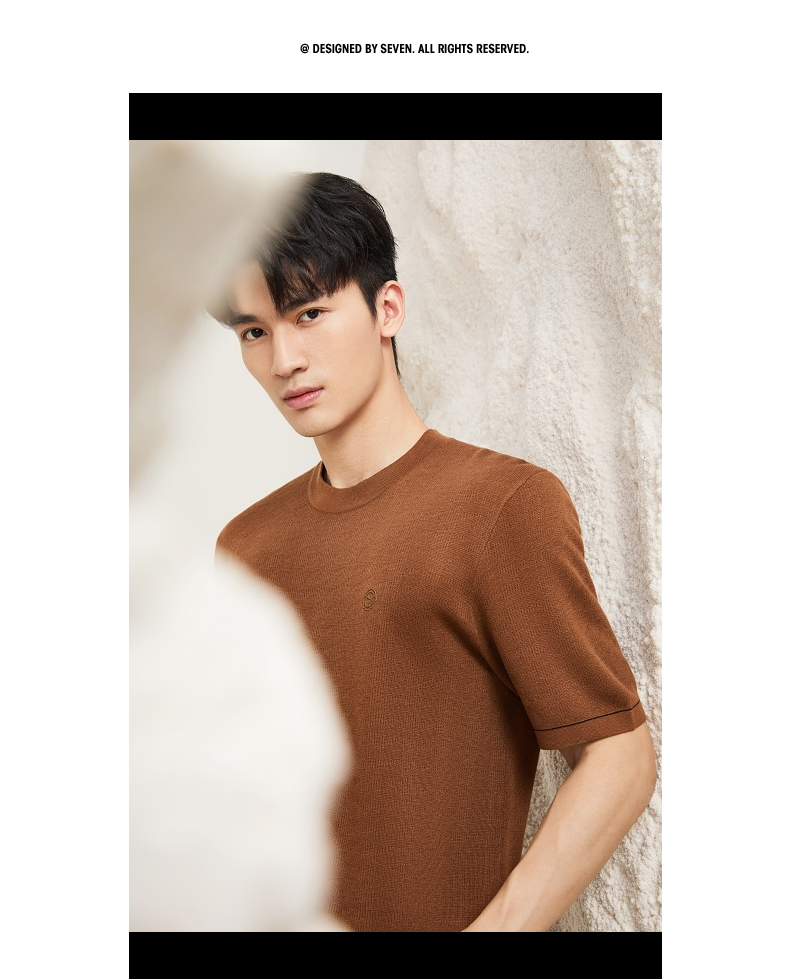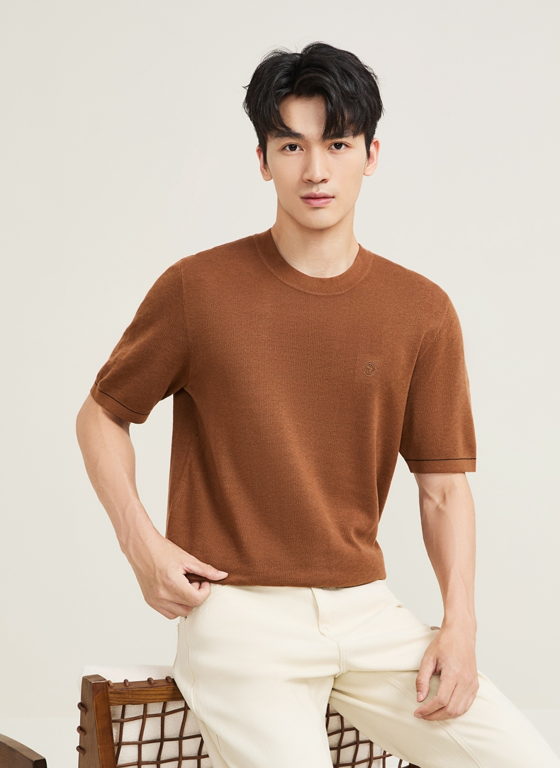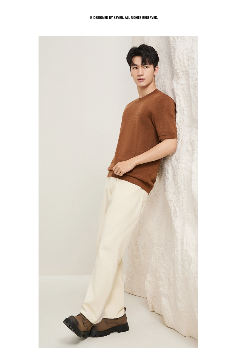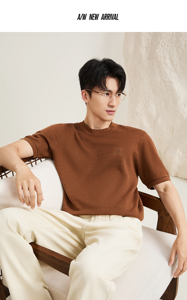 【含羊绒/短袖针织衫】柒牌男装圆领短袖百搭舒适圆领提花套头薄毛衫129Y70640