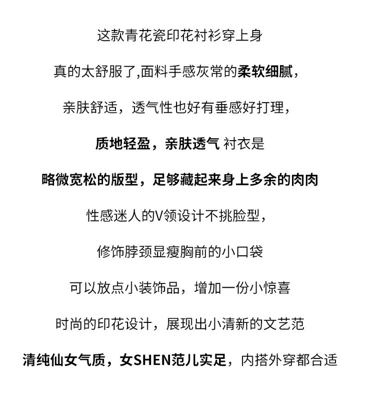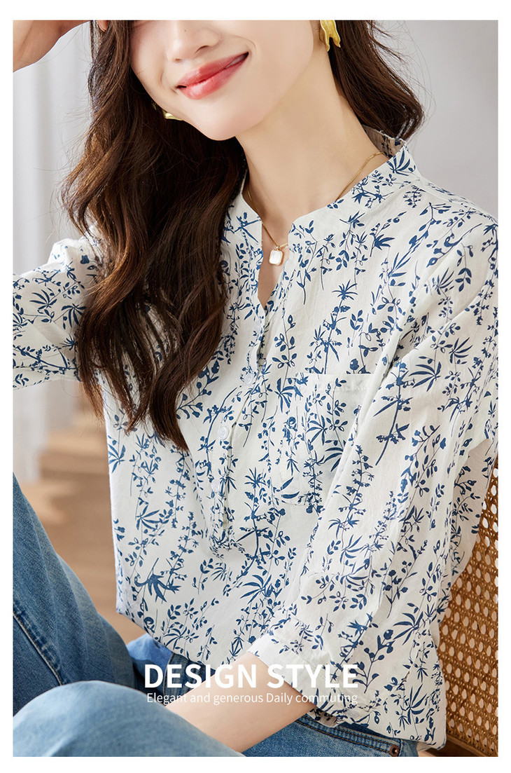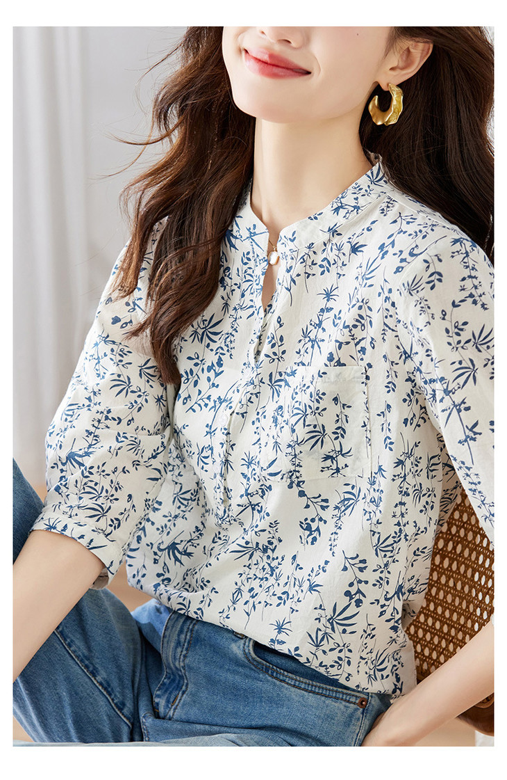 青花瓷小碎花衬衫七分袖夏季国风纯棉上衣别致减龄衬衣MJ-35026