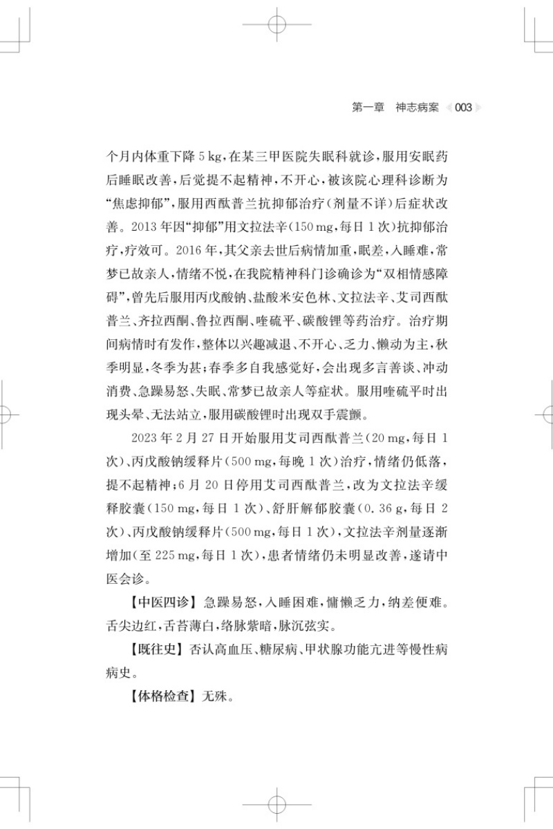 本书从中西医结合诊疗神志病的视角遴选总结了本院中医神志病科成立以来的14个有效典型临床案例,案例分为神志病案、情志病案和形神失和病案三个类别。书中每个医案均体现中西医不同参与度及各有侧重的中西医结合诊疗过程,且有细致的中医病因病机分析,并结合案例涉及内容以问答形式对个案的难点问题开展了讨论。在每个医案结束后,附有相似症情的古代医案,并作简要分析供读者拓展阅读。此外,本书在附录中将病因病机分析出现的中医四大经典经文和常用的神志病诊疗方剂、抗精神病及抗抑郁药物进行了分类整理,供读者索引参考使用。 本书可供从事精神心理疾患诊疗的中医临床工作者,及参加西医学习中医的精神科医务人员参考阅览。
