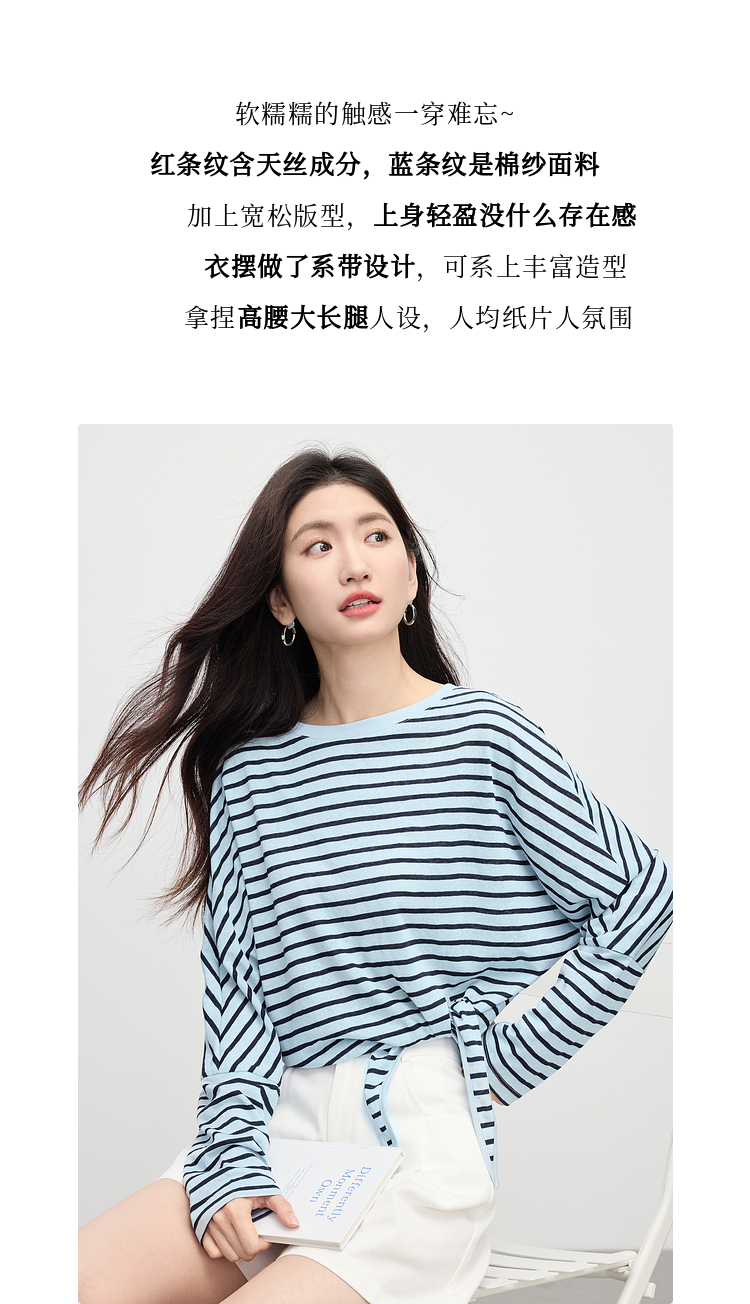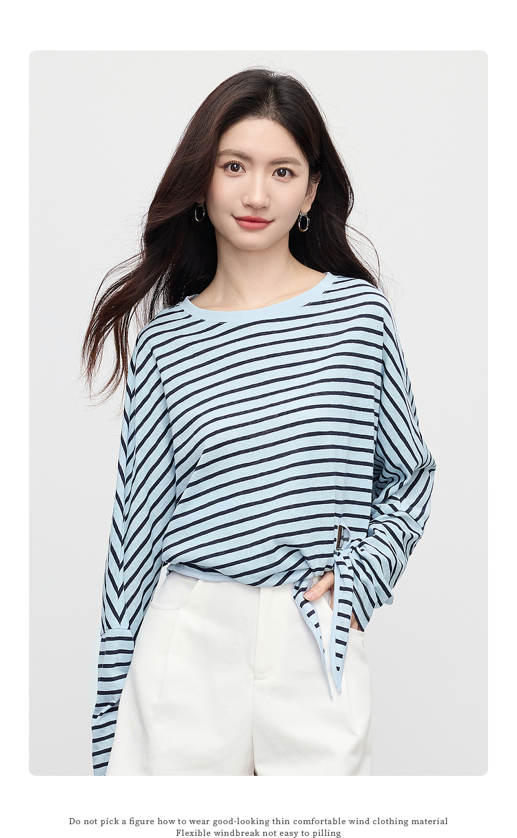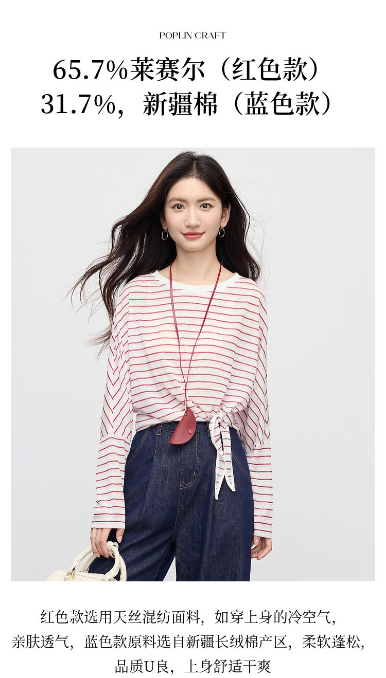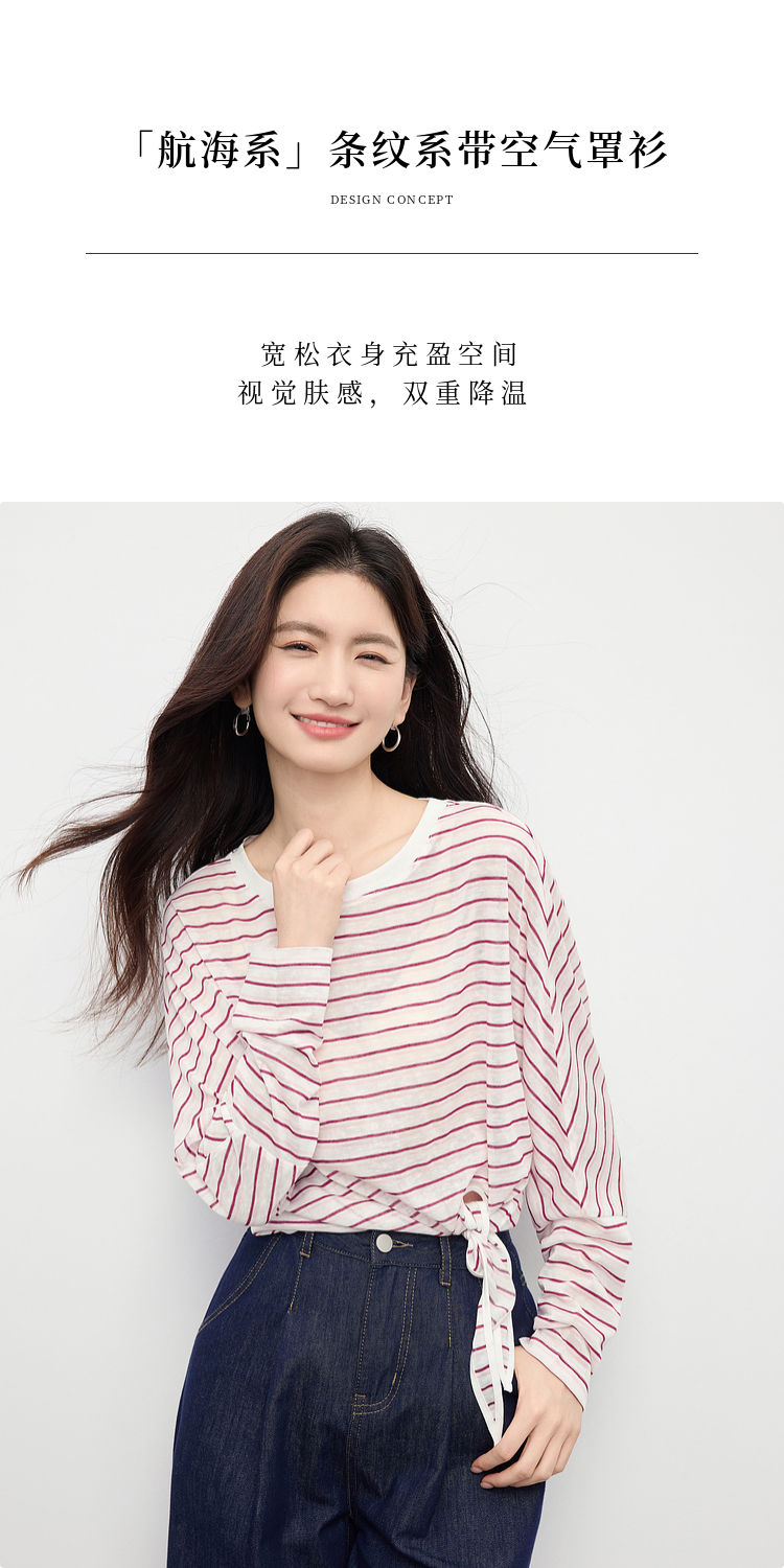 【夏日新品】熙世界莱赛尔条纹T恤罩衫女夏季薄款休闲松弛感宽松防晒长袖上衣