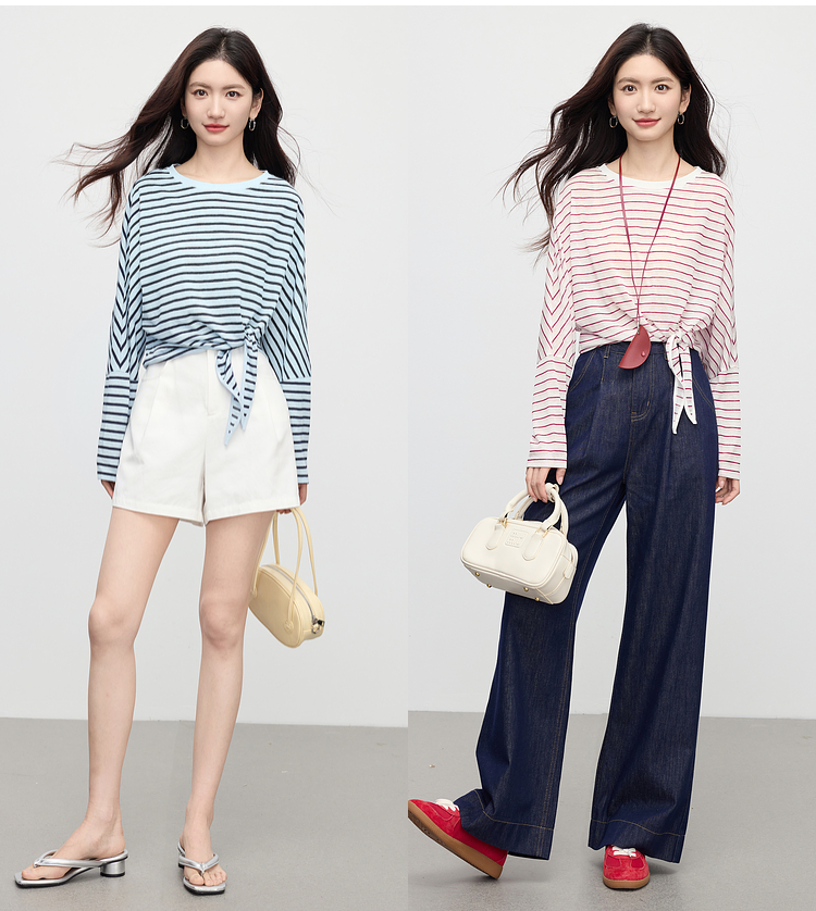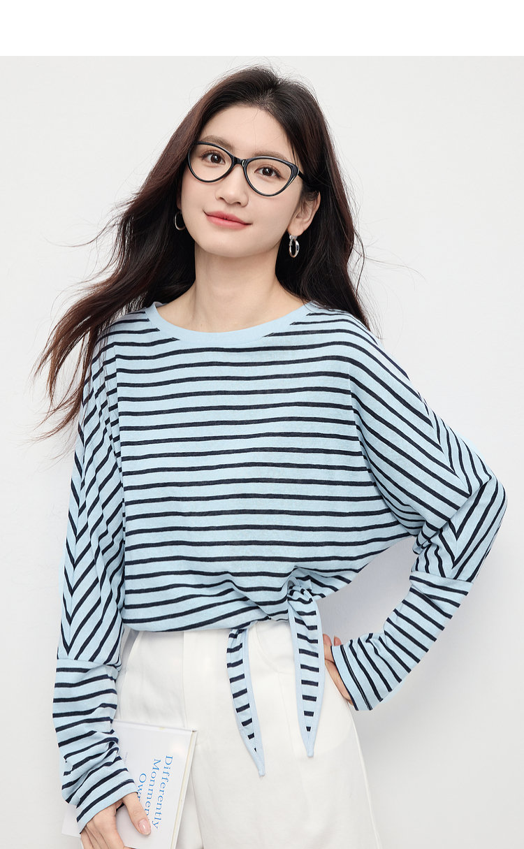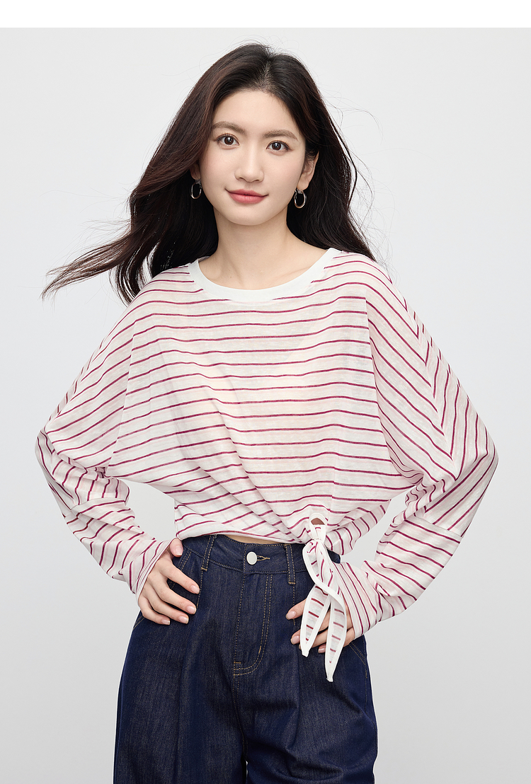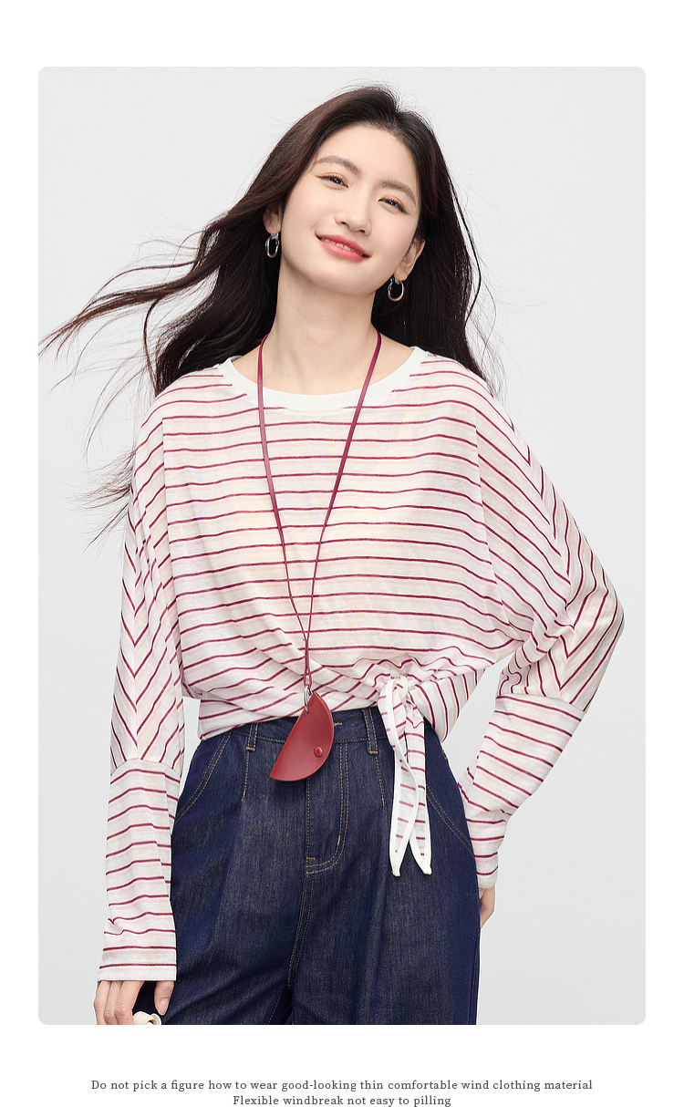 【夏日新品】熙世界莱赛尔条纹T恤罩衫女夏季薄款休闲松弛感宽松防晒长袖上衣