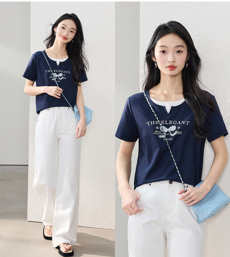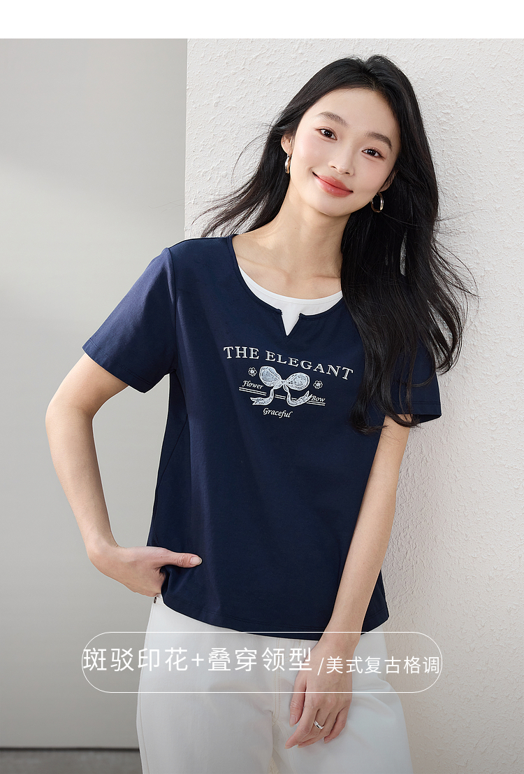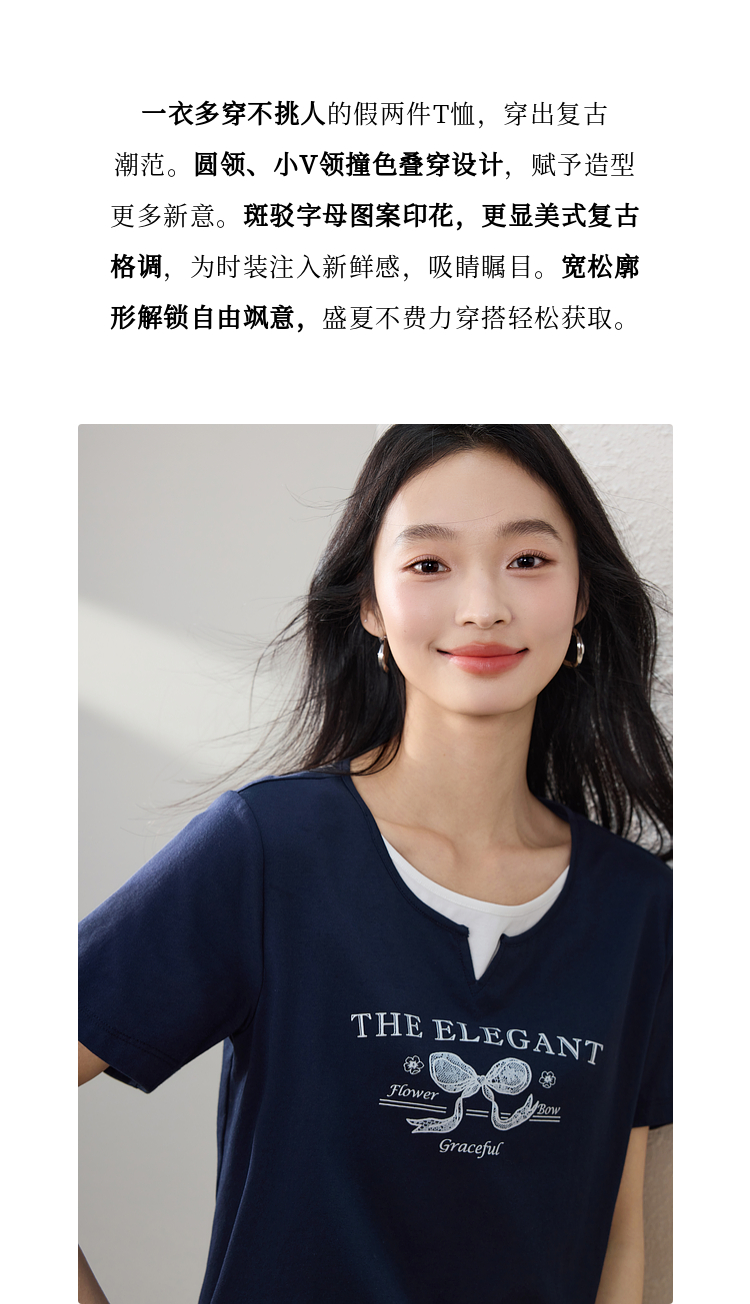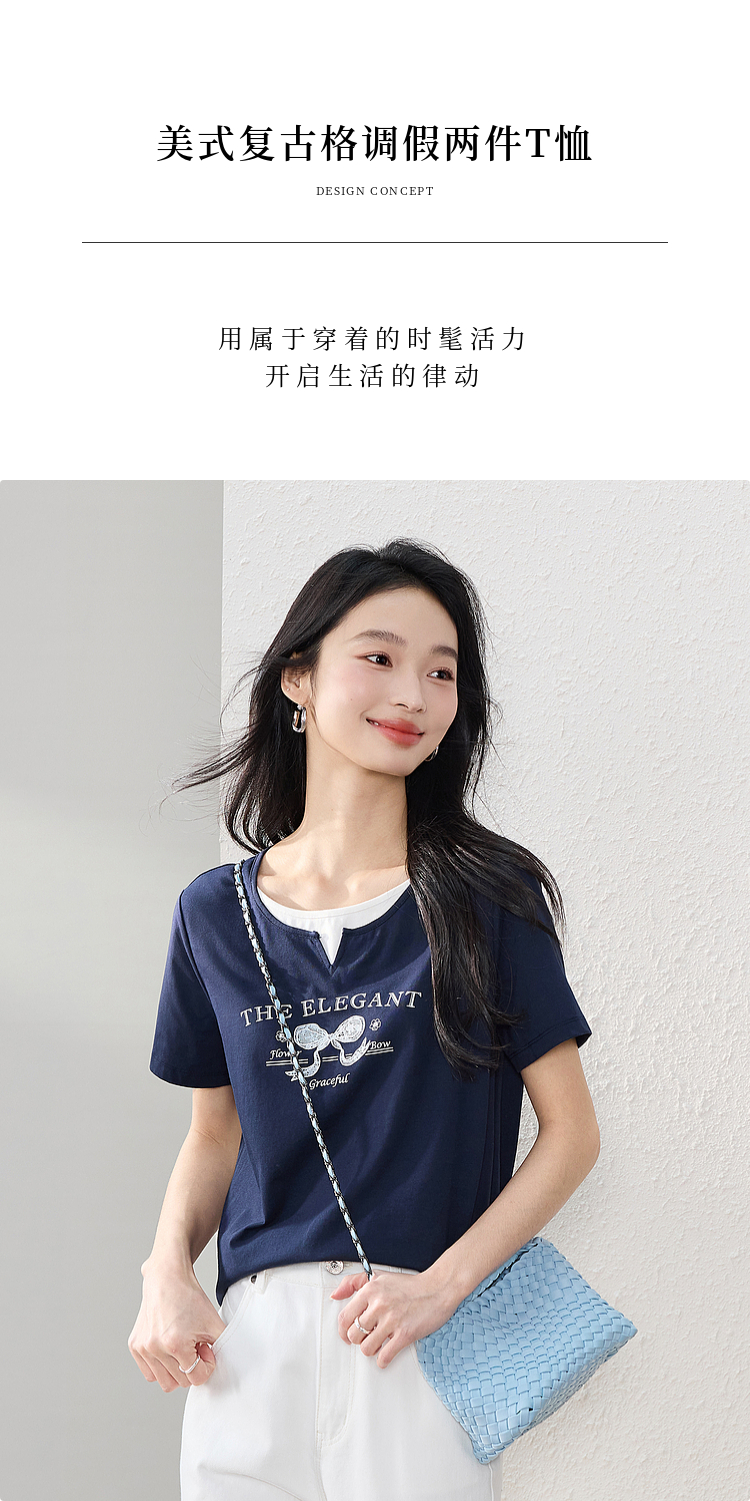 熙世界2025年夏季新款美式复古假两件T恤女短袖休闲圆领印花上衣