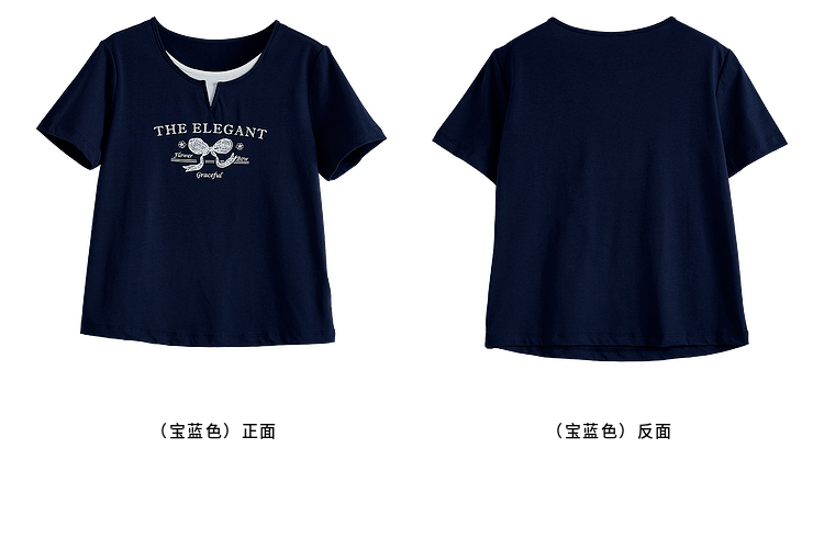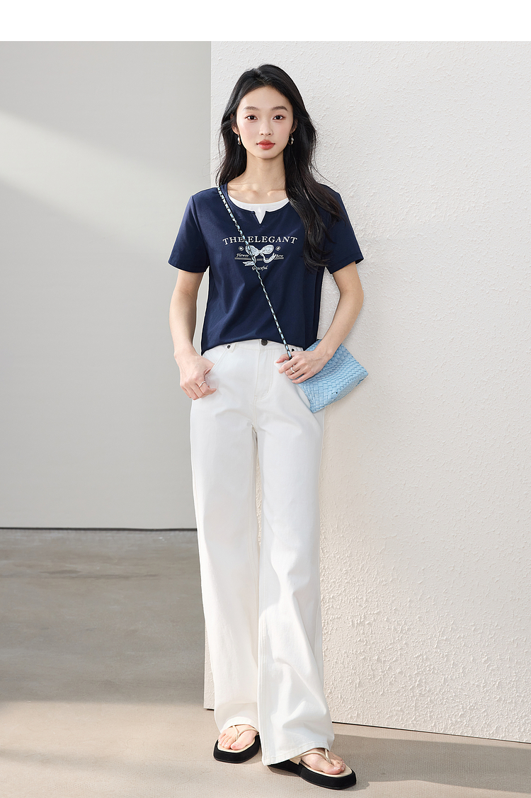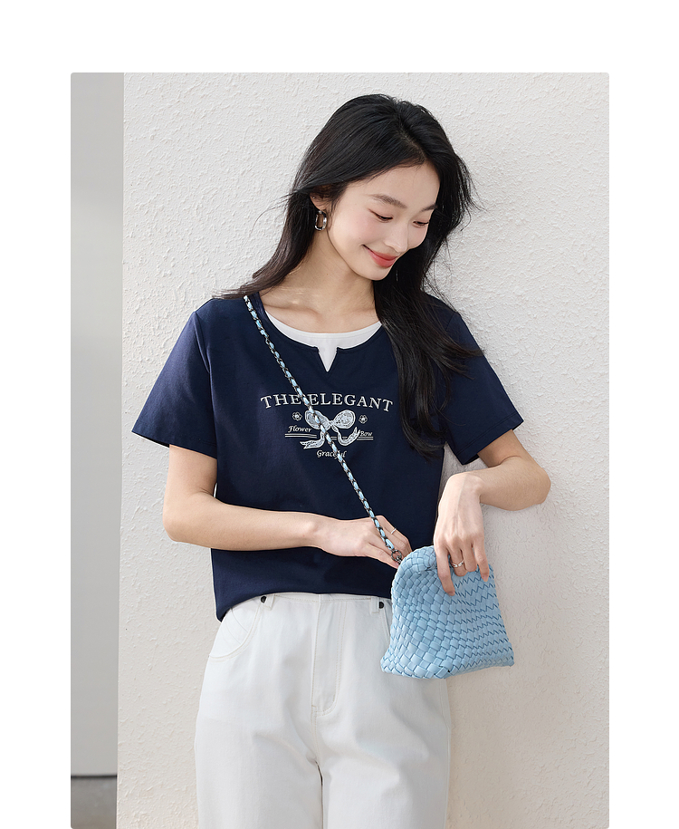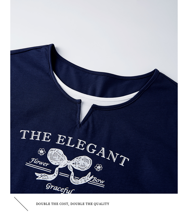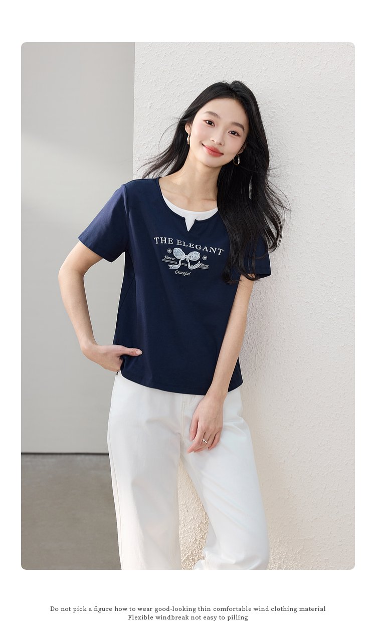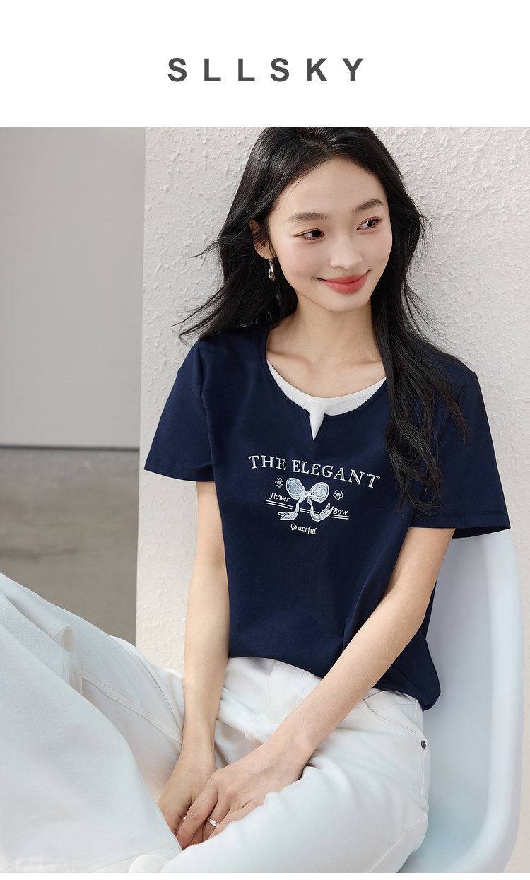 熙世界2025年夏季新款美式复古假两件T恤女短袖休闲圆领印花上衣