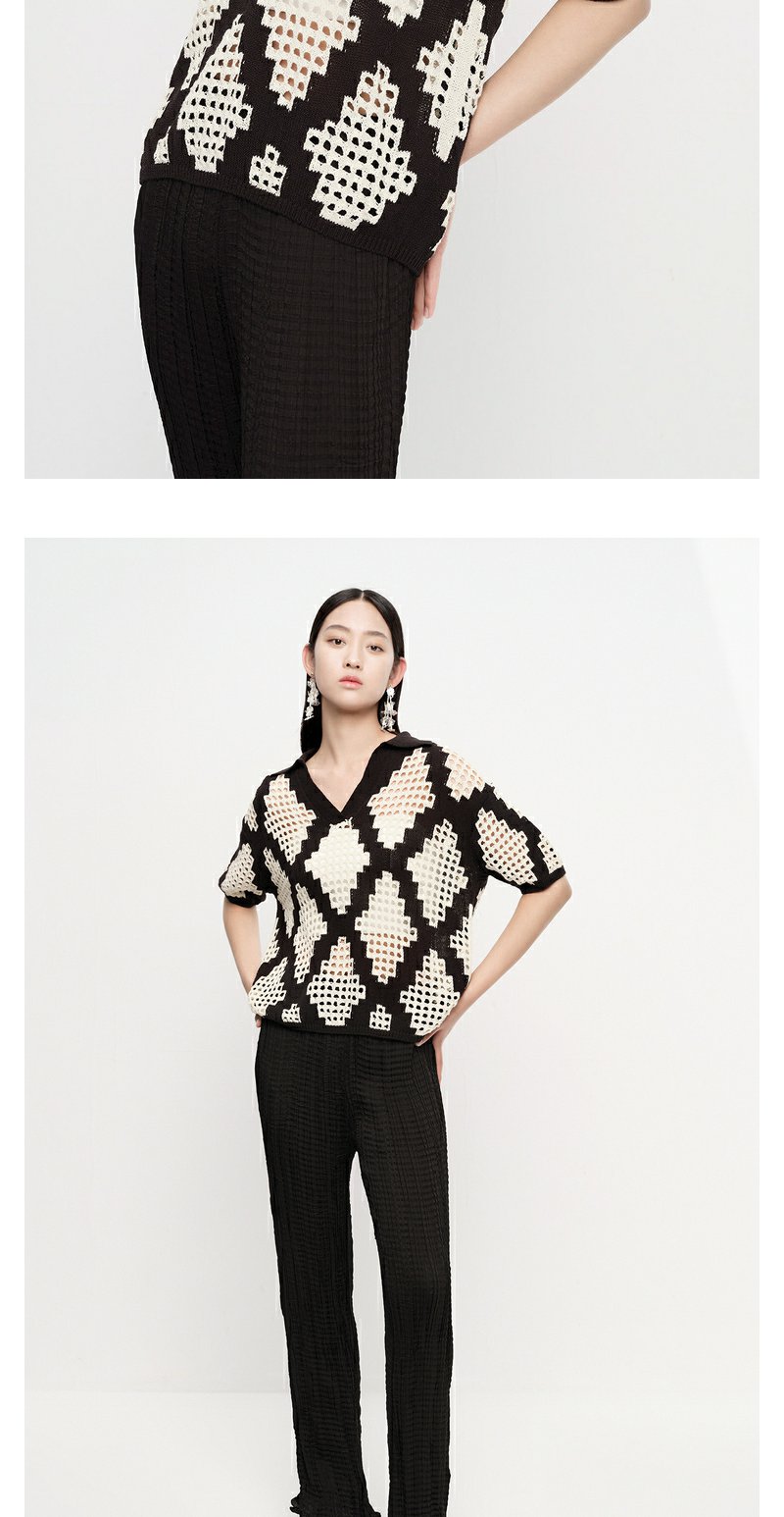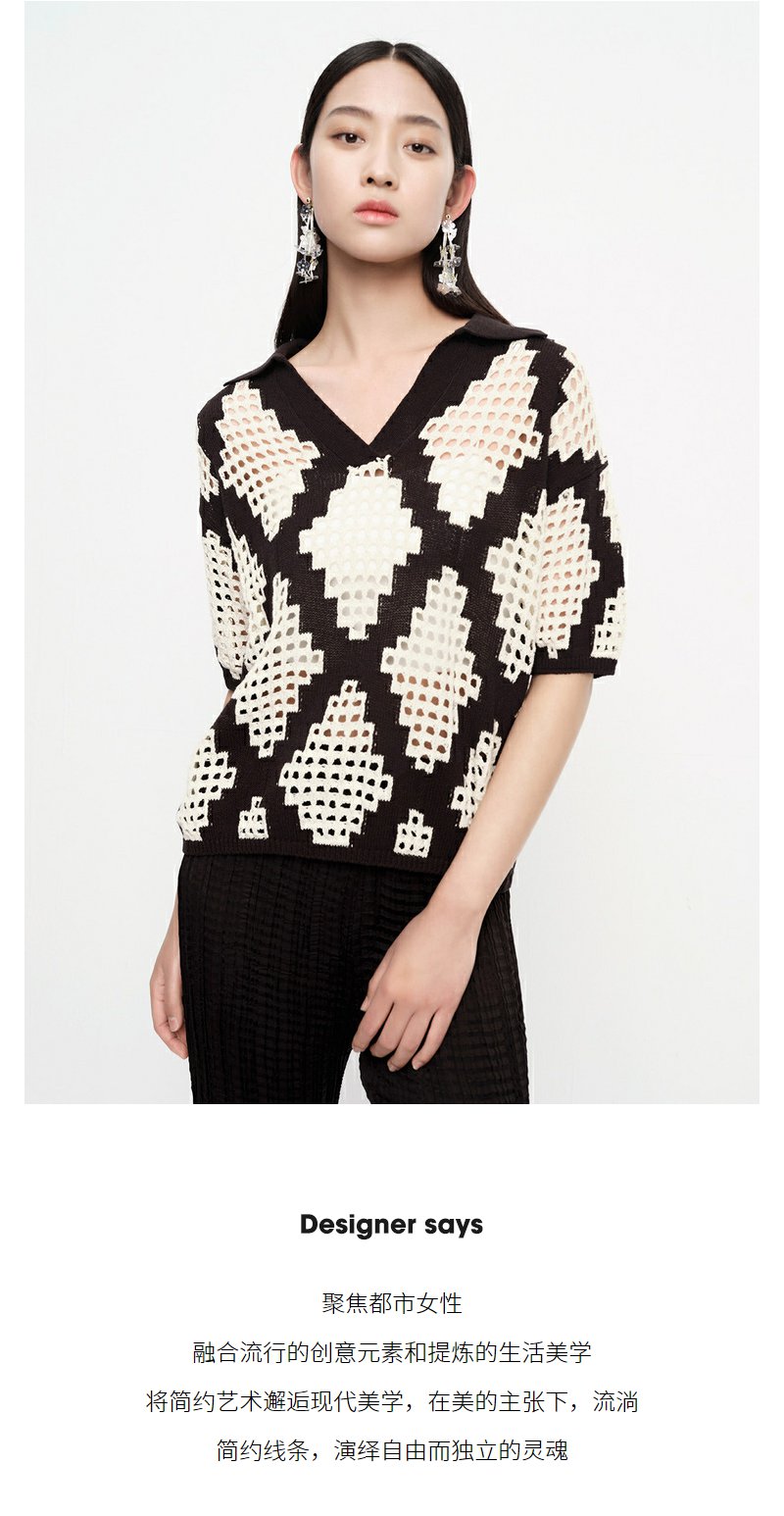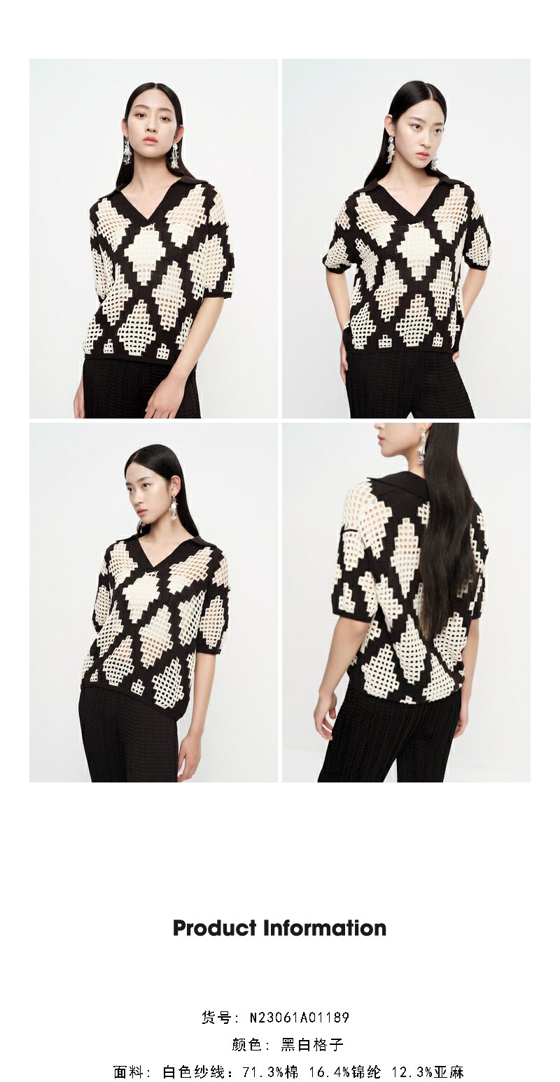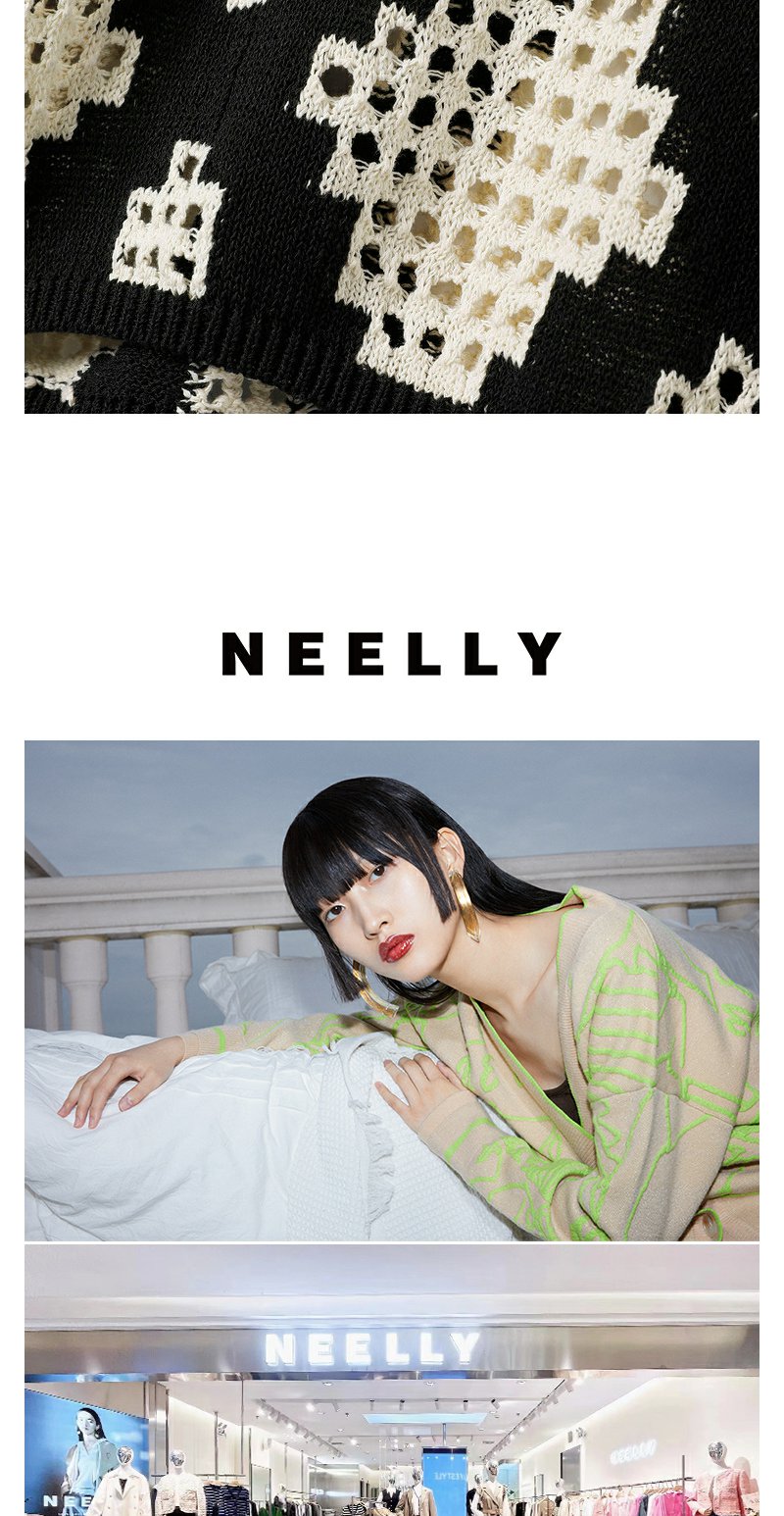 NEELLY纳俪商场同款气质V领镂空菱格针织衫女套头短袖夏季上衣N23061A01189