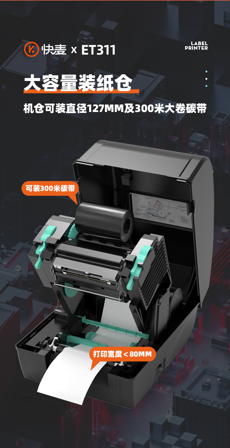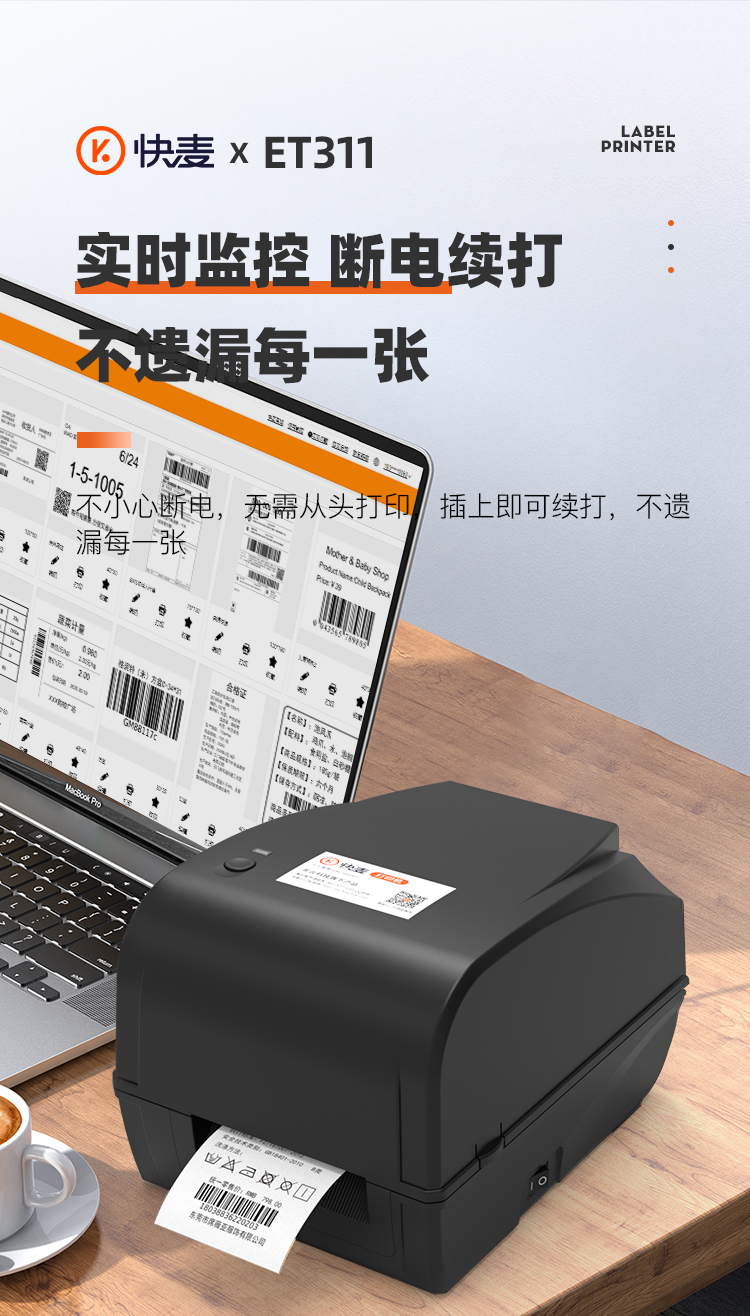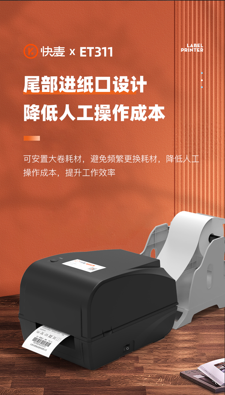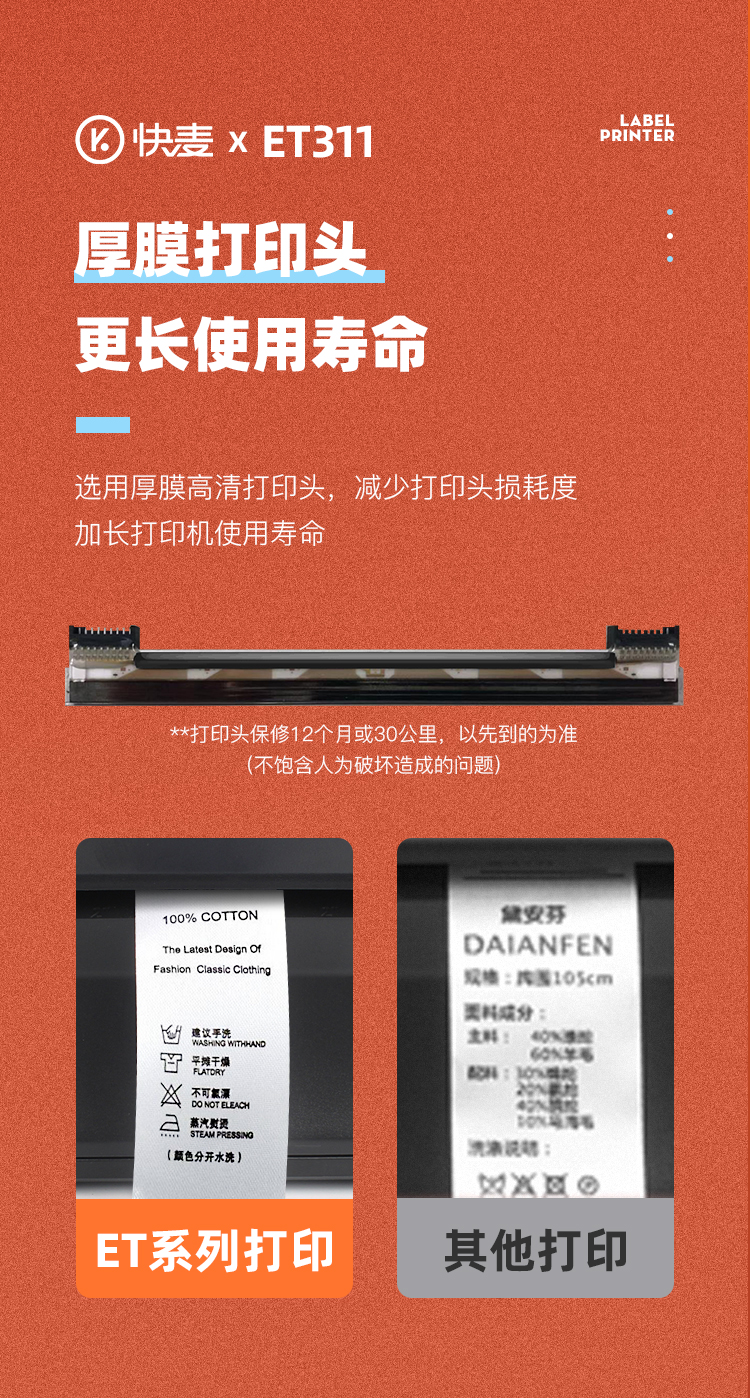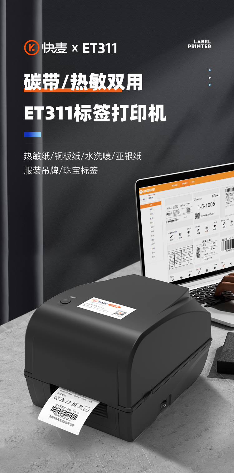 快麦ET311碳带条码机服装吊牌合格证标价洗水唛缎带珠宝货架铜版亚银不干胶贴纸固定资产热转印标签打印机