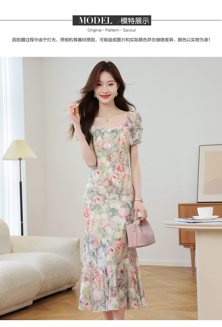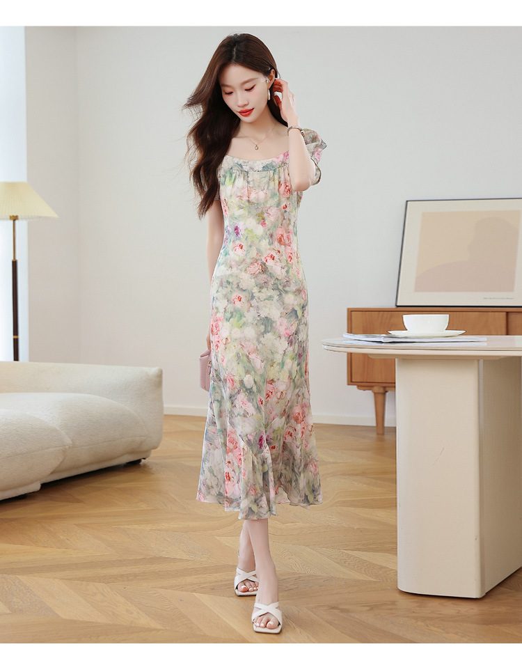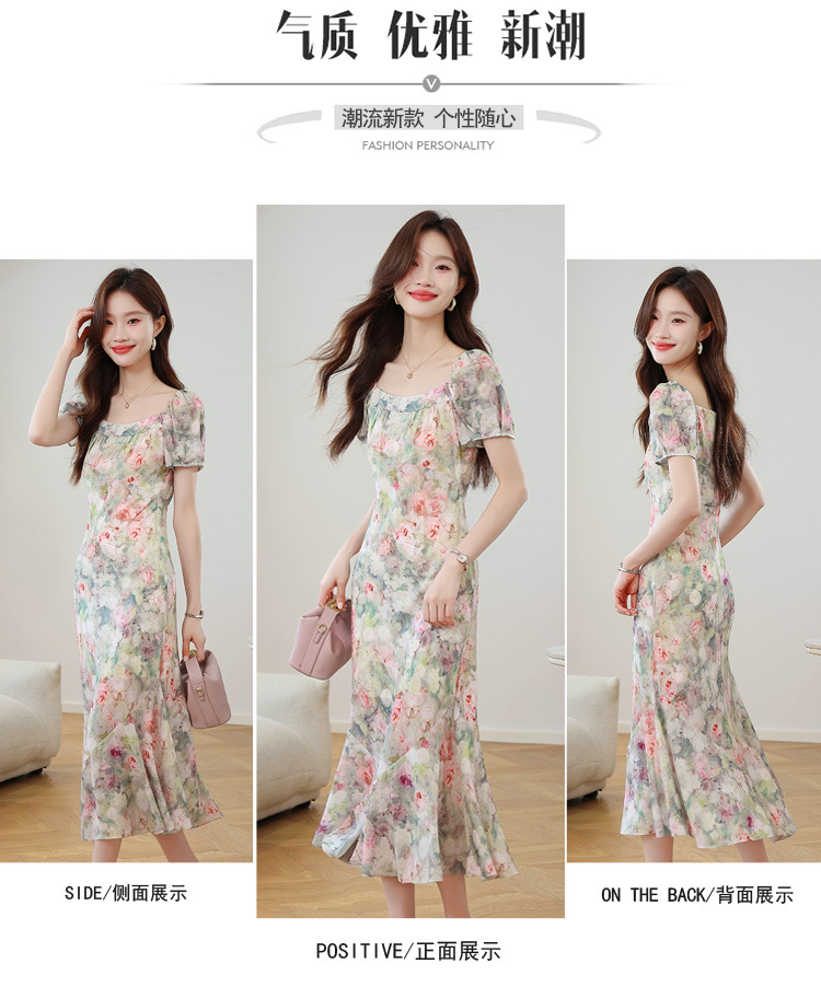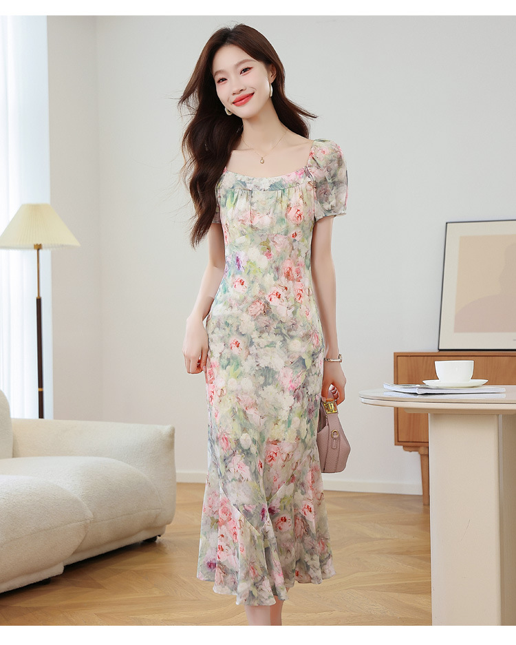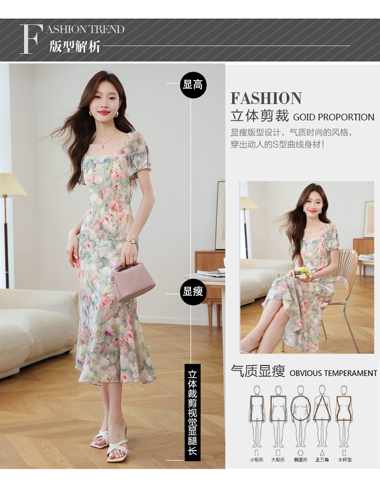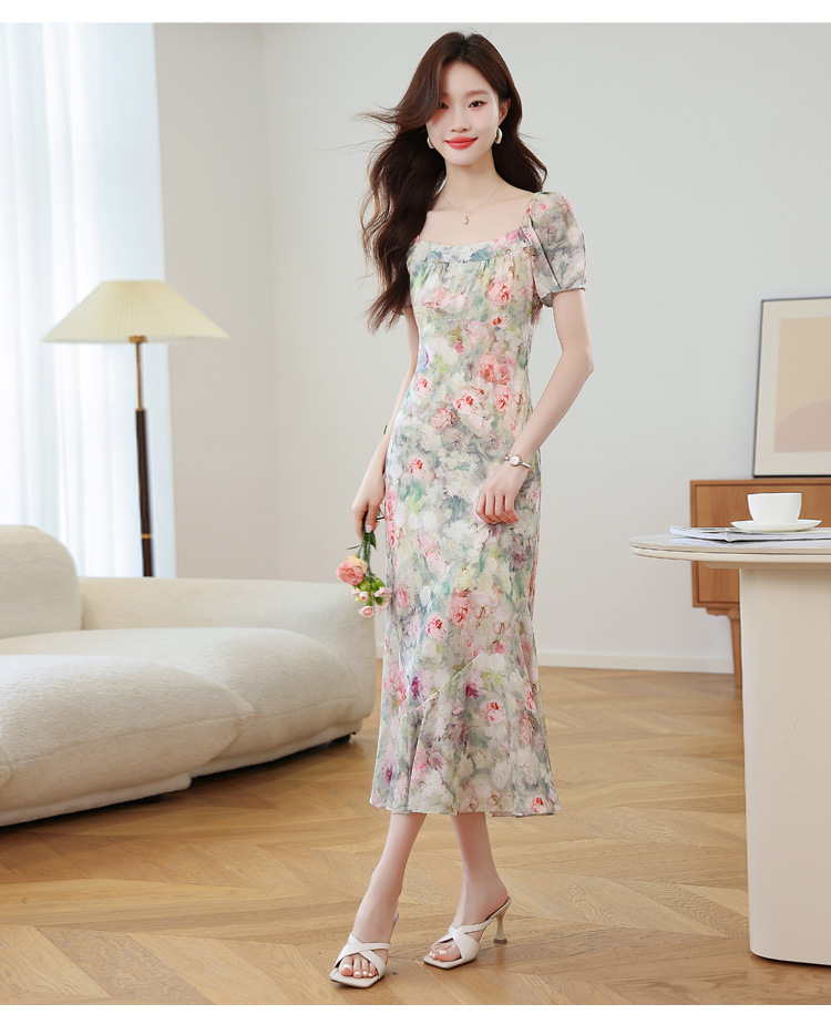 2025新款泡泡袖碎花连衣裙法式方领度假荷叶边鱼尾长裙HR-AIMI8269
