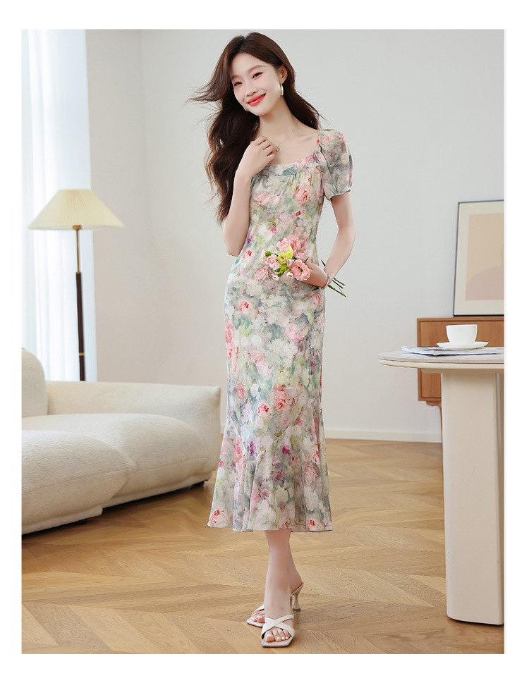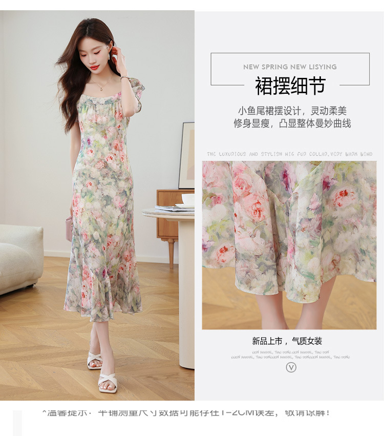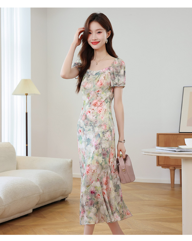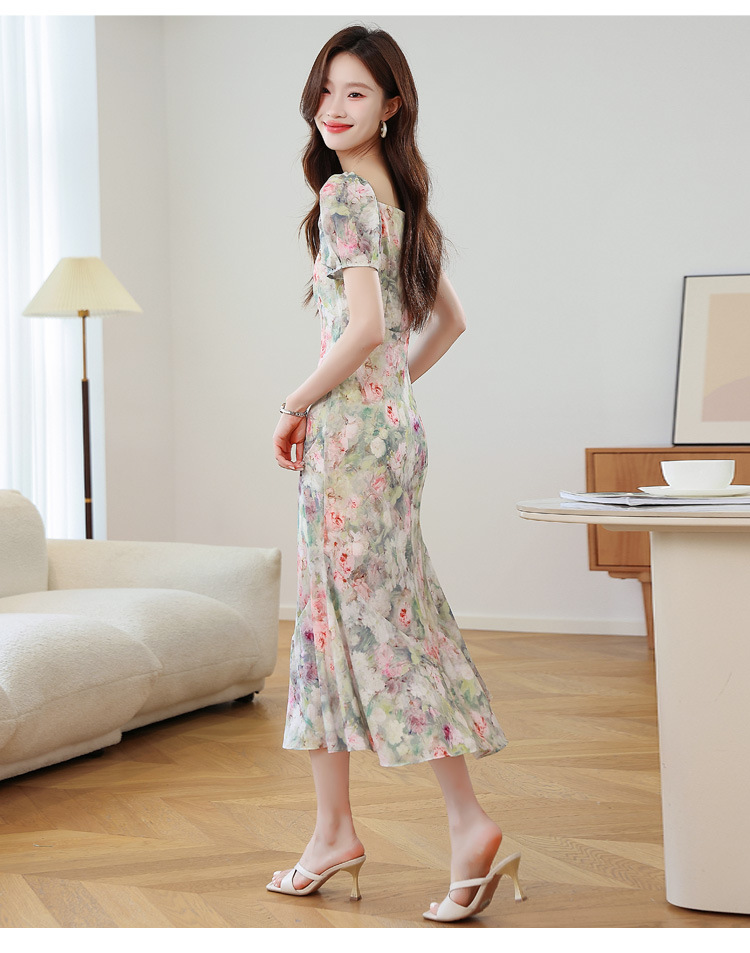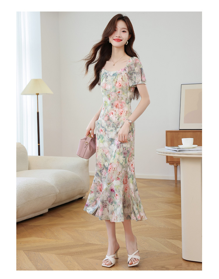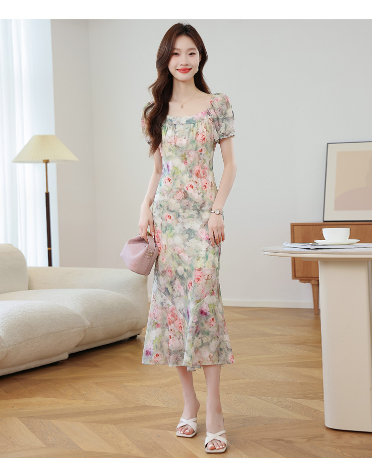 2025新款泡泡袖碎花连衣裙法式方领度假荷叶边鱼尾长裙HR-AIMI8269