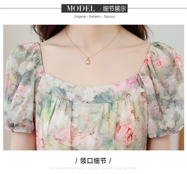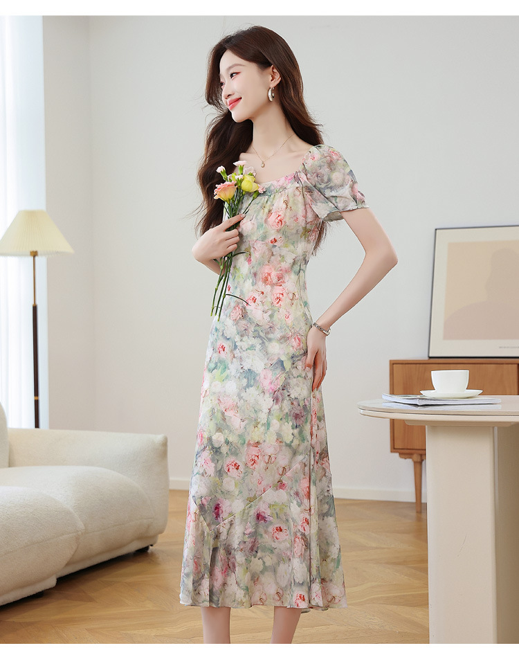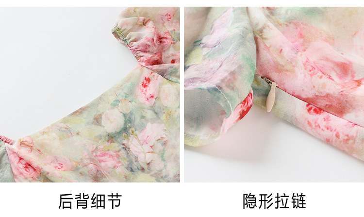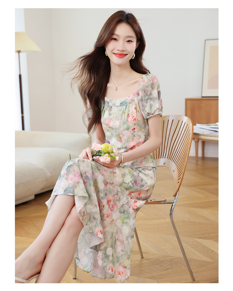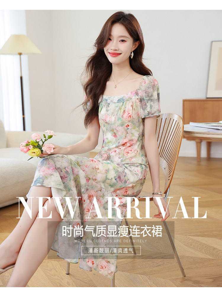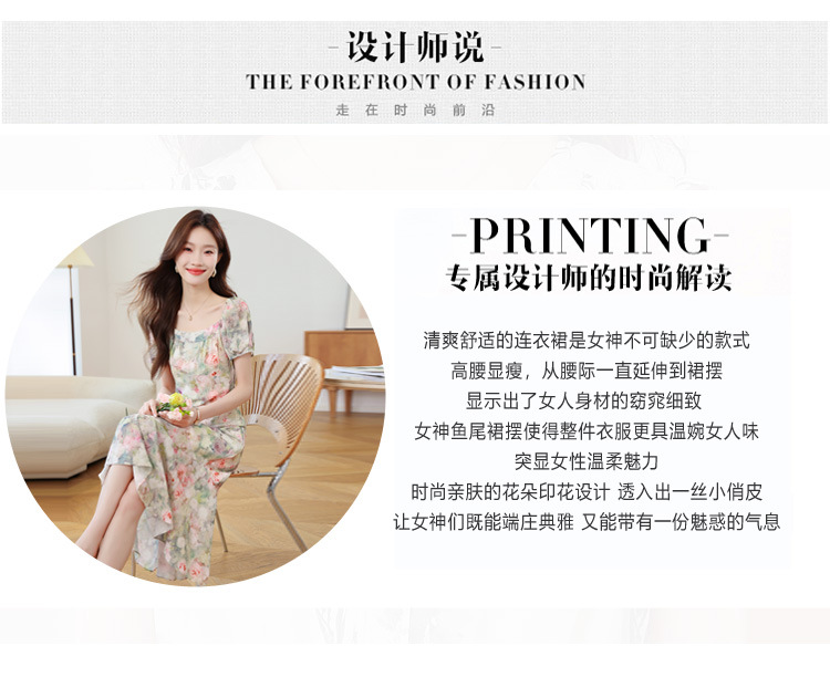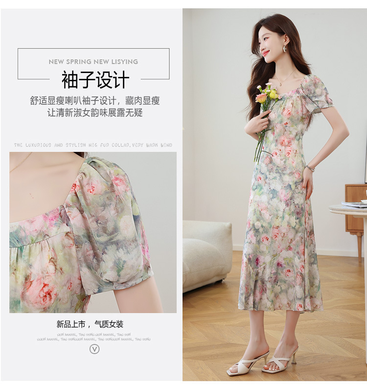 2025新款泡泡袖碎花连衣裙法式方领度假荷叶边鱼尾长裙HR-AIMI8269