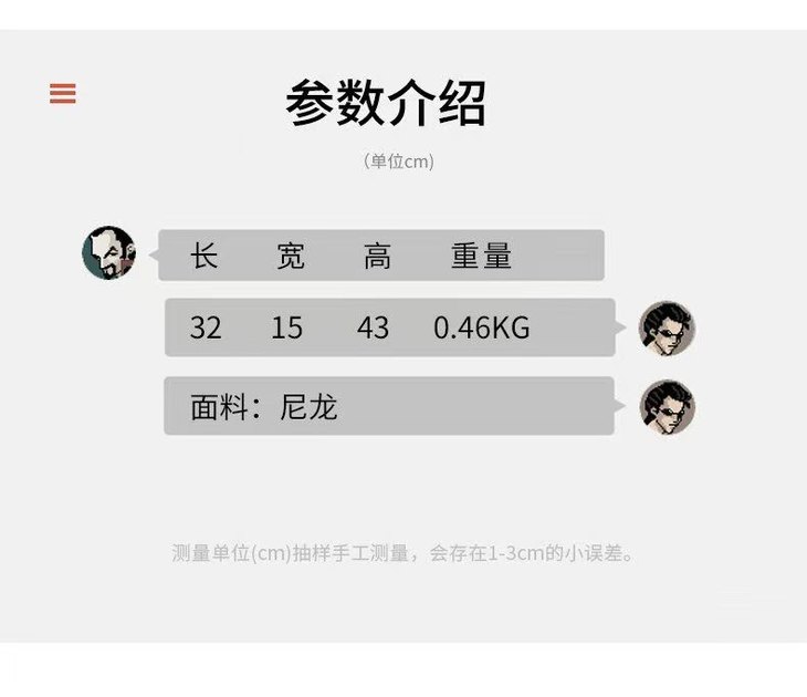 耐磨防刮,非常好打理自重也很很轻,不会给身体造成额外的负担背着它出去远足很nice!