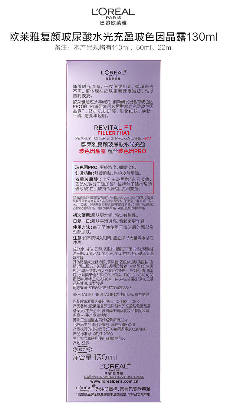 欧莱雅复颜玻尿酸水光充盈玻色因晶露130ml/瓶