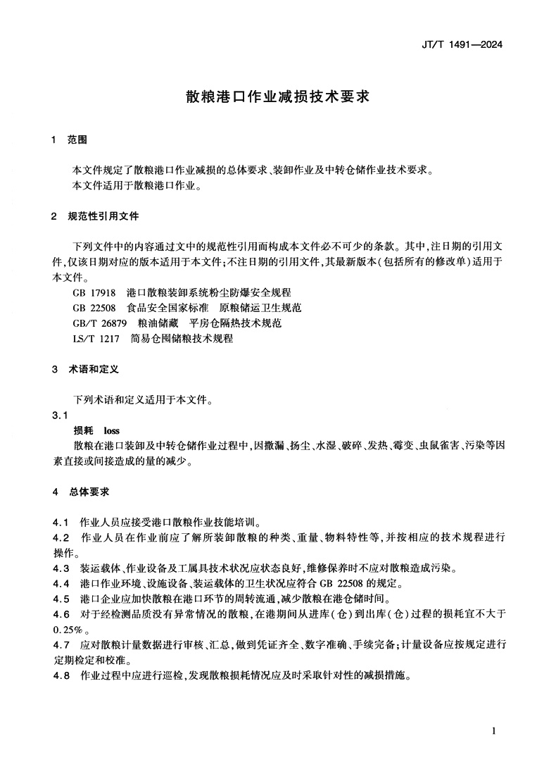 散粮港口作业减损技术要求(JT/T 1491—2024)