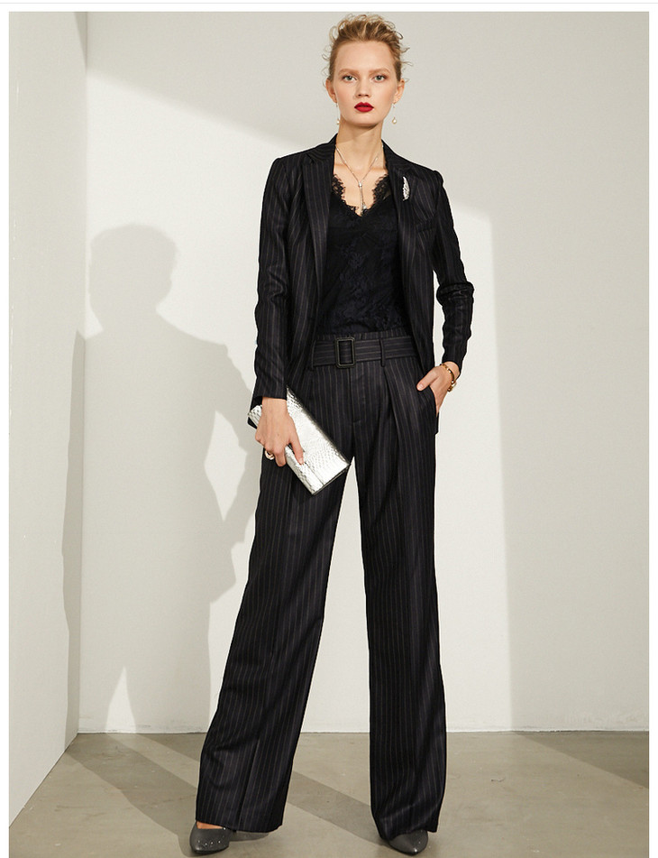 J83A3395颈袖添香冬季羊毛条纹OL气质职业装女士小西装裤套装时尚正装J83A3395