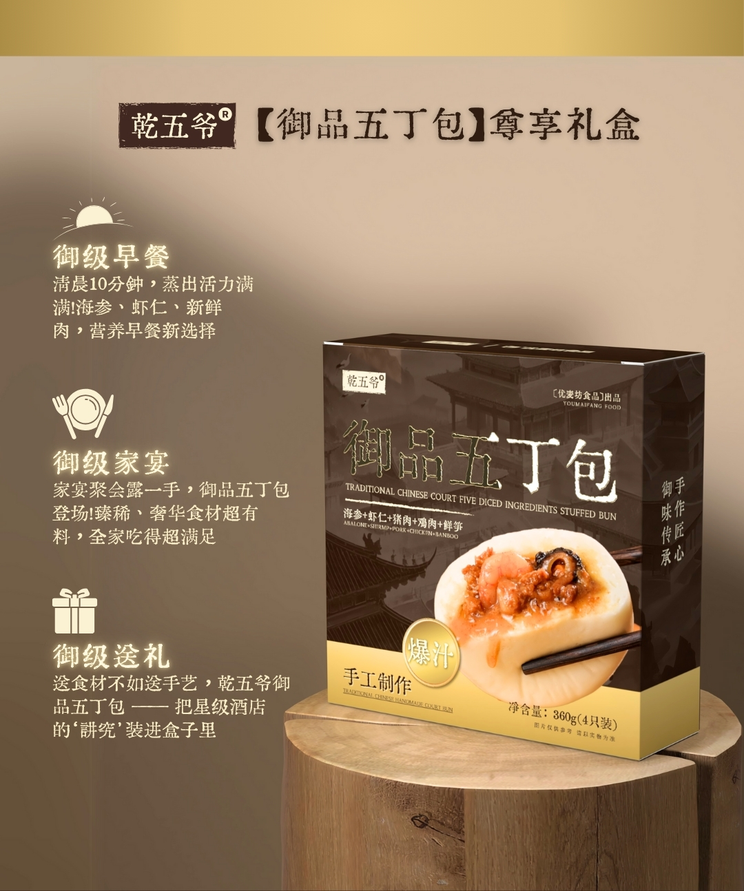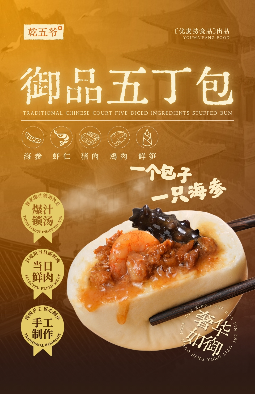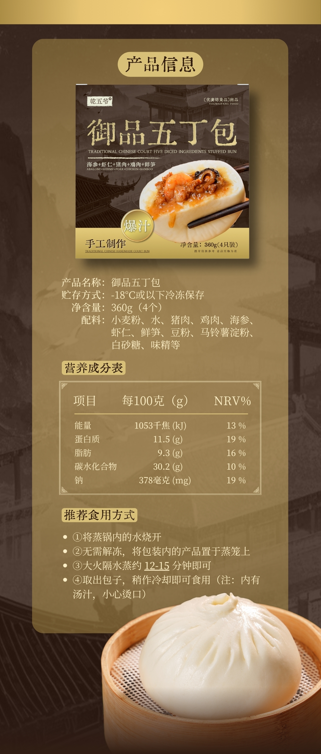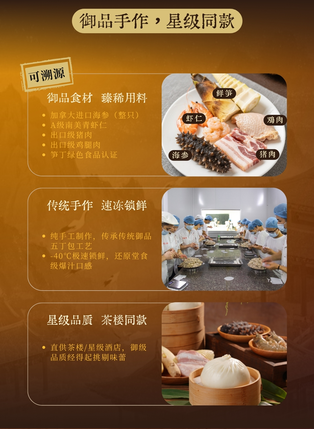 甄选小麦粉、海参、青虾仁、猪肉、鸡腿肉、笋丁为原料,精心调味;