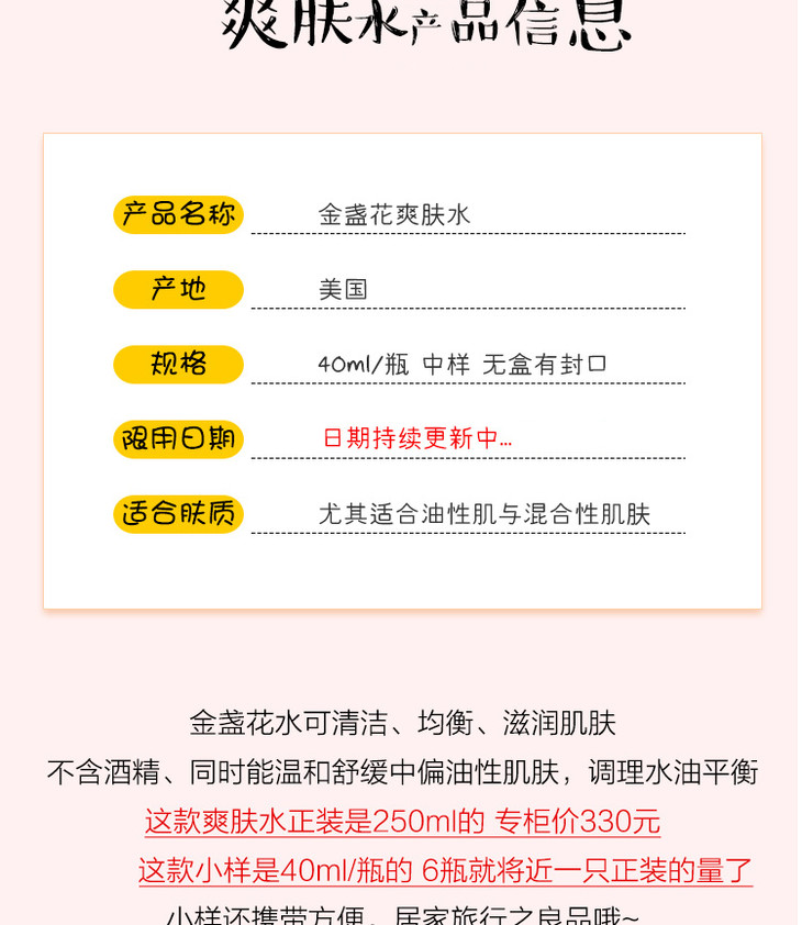 科颜氏金盏花爽肤水中样40ml 湿敷专柜小样
