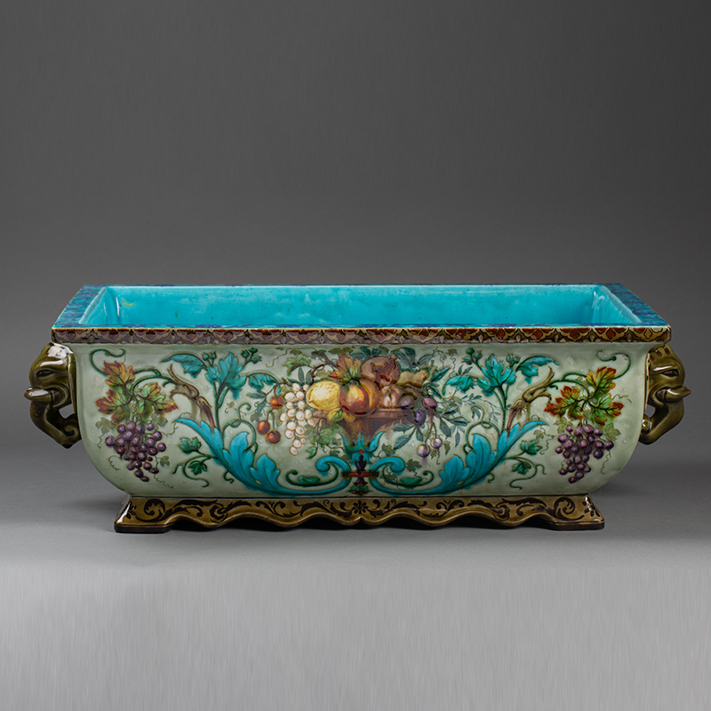 独角鹿西洋古董 1875年代法国陶艺家Théodore Deck签名出品东方风格象首双柄装饰硕果花卉主题彩釉花盆套
