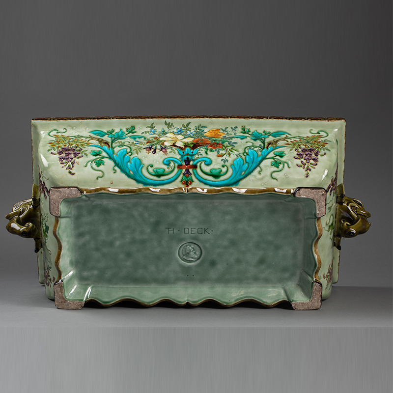1875年代法国陶艺艺术家Théodore Deck签名出品东方风格象首双柄装饰硕果花卉主题彩釉花盆套