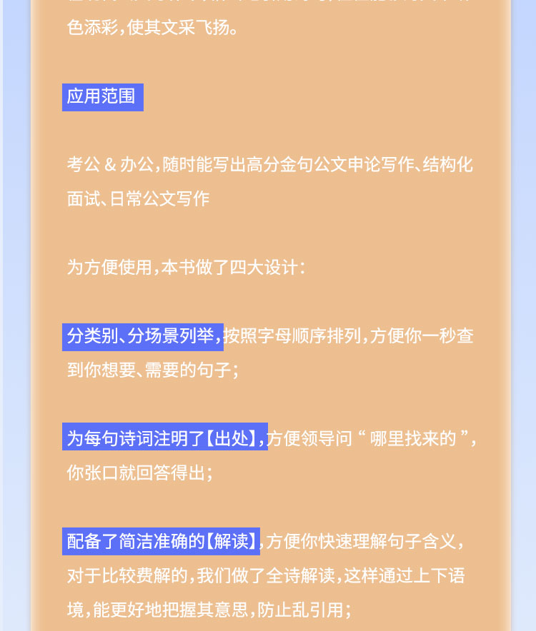 帮助读者快速把握主题核心,找准金句运用方向;每则古诗词金句后均配有精练解析,不仅清晰标