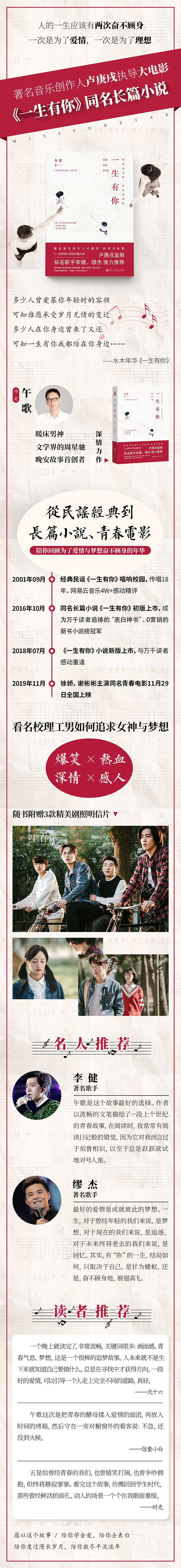 那些年, 我们的青春与梦想。每个人的一生都有一个“你”,这个“你”, 给我们留下了刻骨铭心的一段感情, 一段记忆, 甚至改变了我们的人生。我很欣慰, 《一生有你》能成为很多人唤回青春记忆的流金旋律, 我希望读者能从这本小说中读出爱情与梦想, 读懂人生路上的曲折与执着。