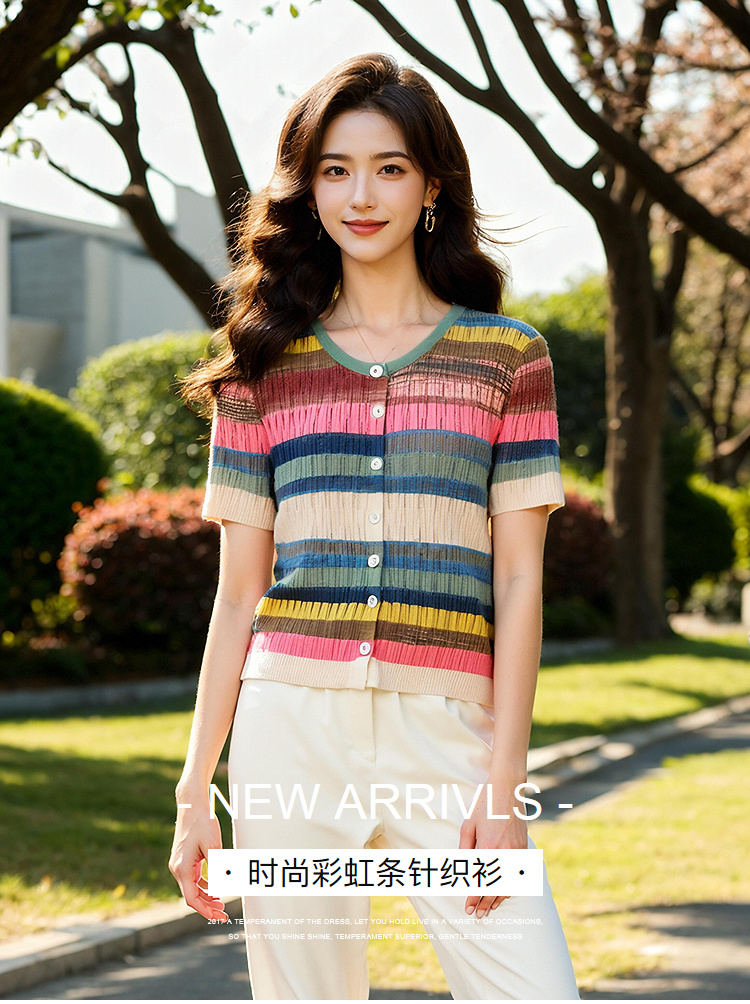 奢姿大码女装2025夏季减龄彩虹条纹针织衫胖妹妹圆领时尚百搭上衣9652690353
