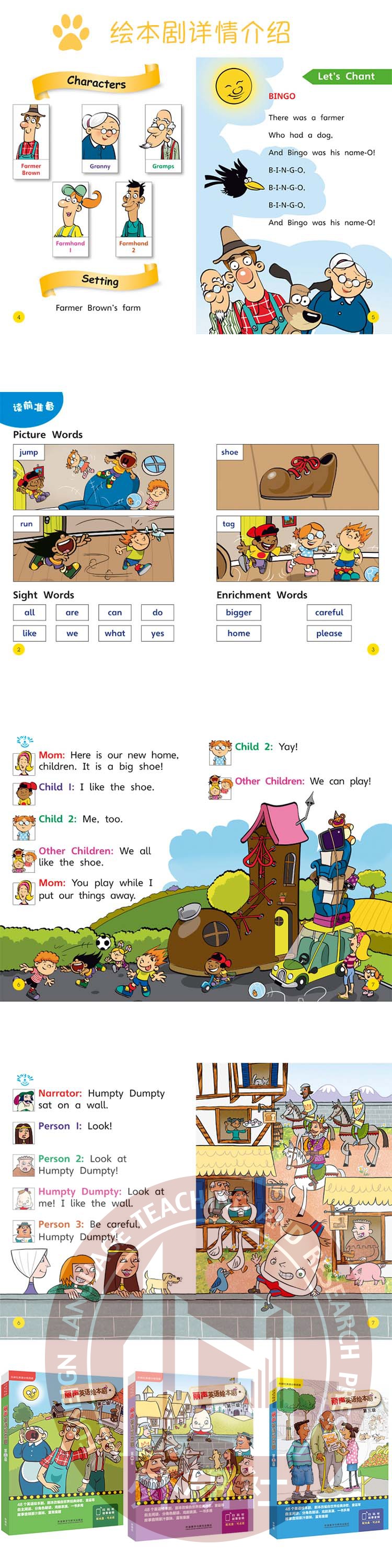 "丽声英语绘本剧"将48个妙趣横生的英语短剧以分级读物形式呈现。编剧不仅精心架构角色、情节、场景等,更让剧中语言凝练、鲜活、极具时代感,营造出类似英语母语下的学习氛围。该系列图书与已经出版的"丽声拼读故事会""丽声经典故事屋""丽声妙想英文绘本"等同属于一个分级体系,共分9个级别,每级包含5~6册故事书,1张MP3光盘和编排指导说明。故事书可用"外研通"点读笔点读,所需声音文件可到 www.viaton.com.cn 网站免费下载。