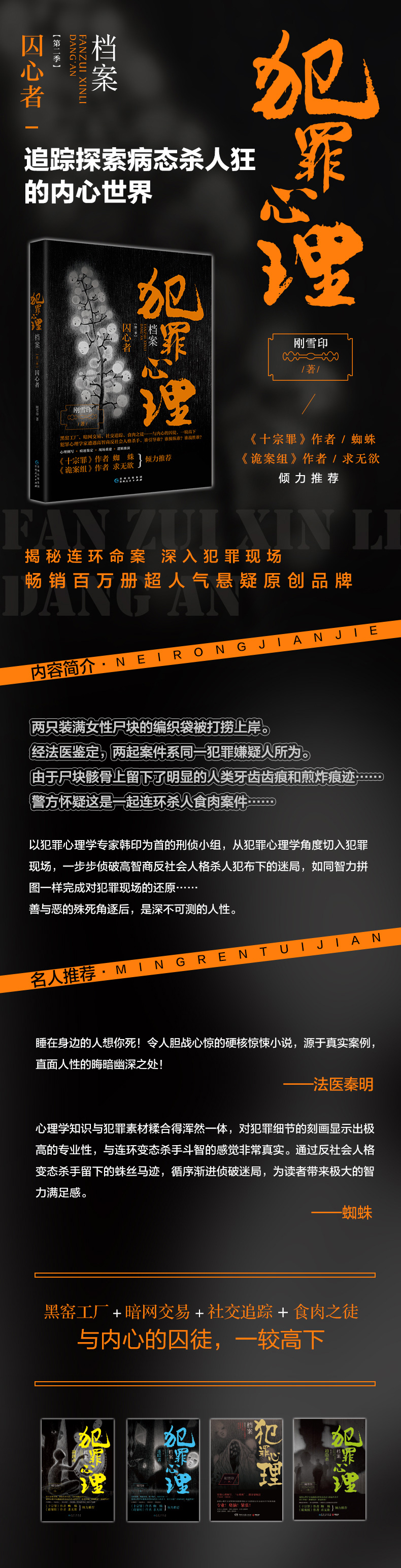 ★探索杀人狂病态心理,解读变态杀人游戏。 剖析连环杀人狂的病态内心世界,从心理学角度切入犯罪现场,一步步侦破高智商反社会连环杀手布下的迷局,如同智力拼图一样完成对犯罪现场的还原,烧脑、紧张、刺激,更强烈的代入感与智力满足! ★囊括当下热门惊悚的犯罪要素,令人心悸胆寒的连环罪案。 源于真实案例的血案:人格畸变、开膛虐尸、尸体工厂、食人恶魔……睡在身边的人想你死!令人不寒而栗的凶案全纪录,真凶以伪善之名隐藏在我们身边,与我们同眠共餐。善与恶的殊死角逐后面,是深不可测的人性。 ★法医秦明、《十宗罪》作者蜘蛛、《诡案组》作者求无欲盛赞的惊心之书!
