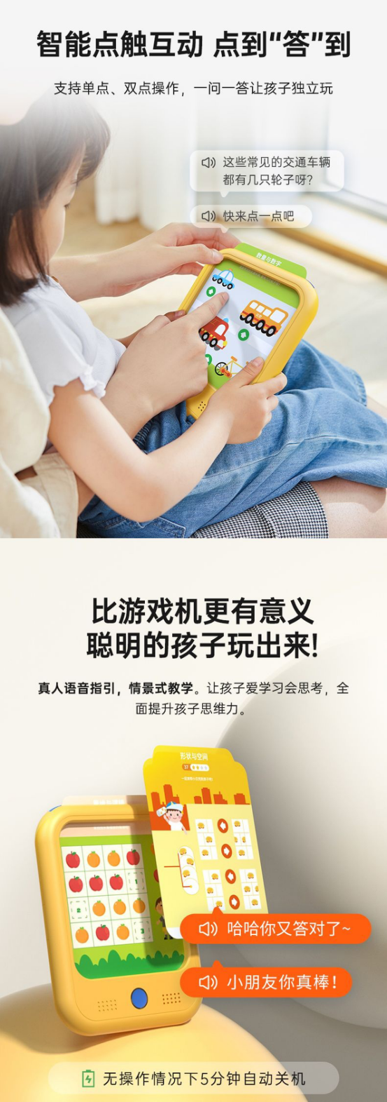 儿童的视力已经成为家长们越来越关心的问题,这款逻辑思维机器采用无液晶屏幕,长时间使用也不会影响视力。 支持单点双点操作,操作简单,真人语音互动,点到答到,在娱乐中学到知识。