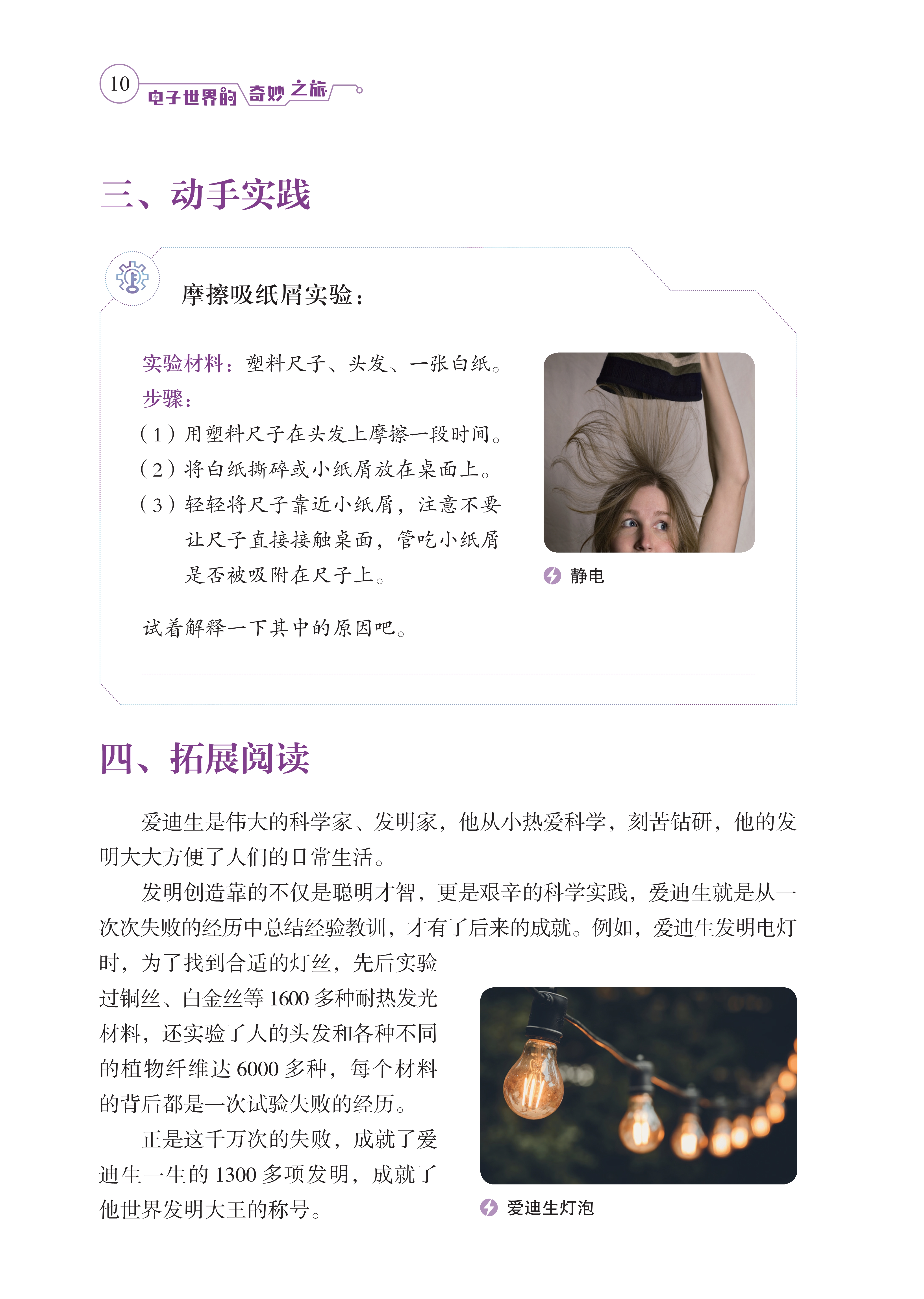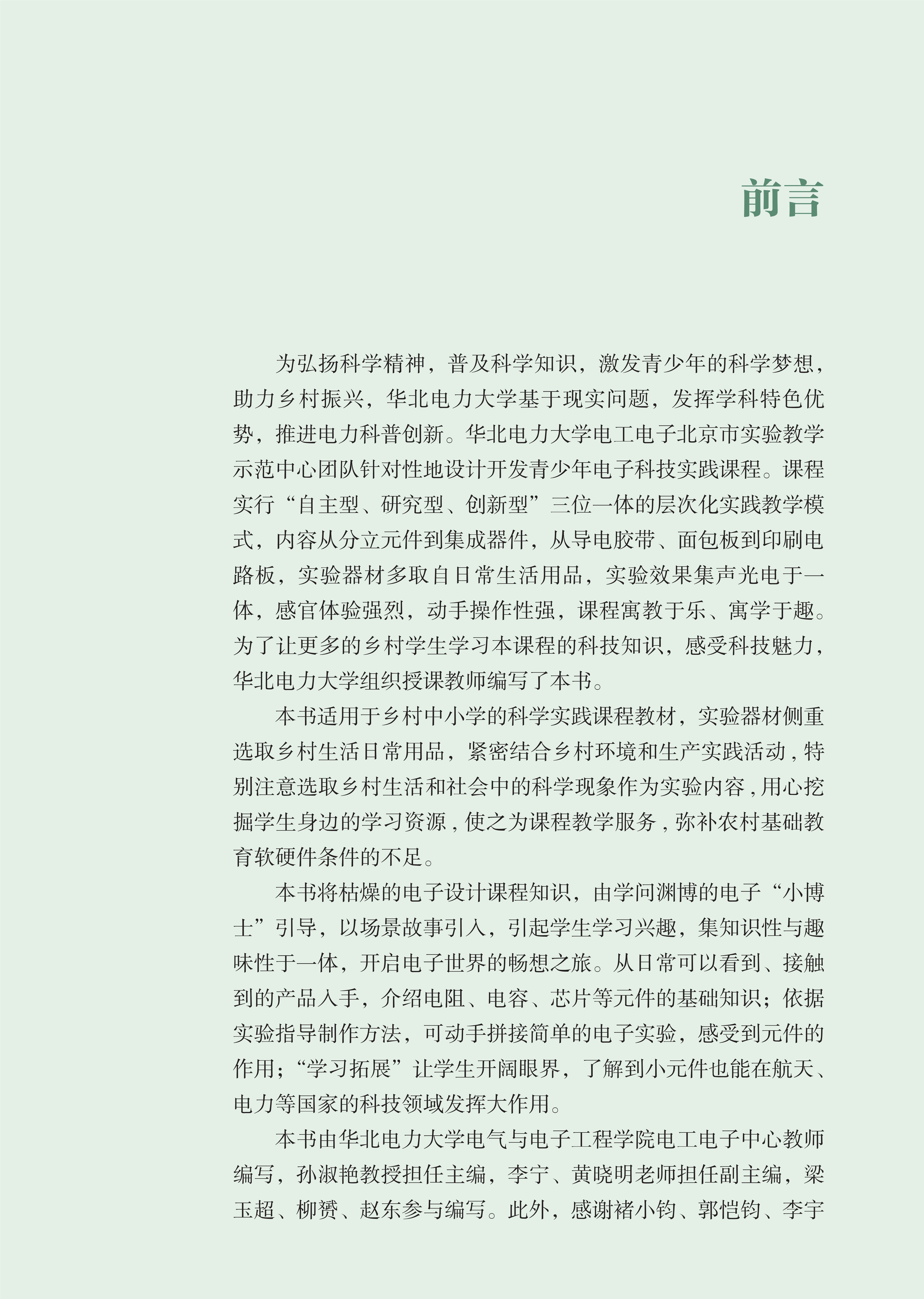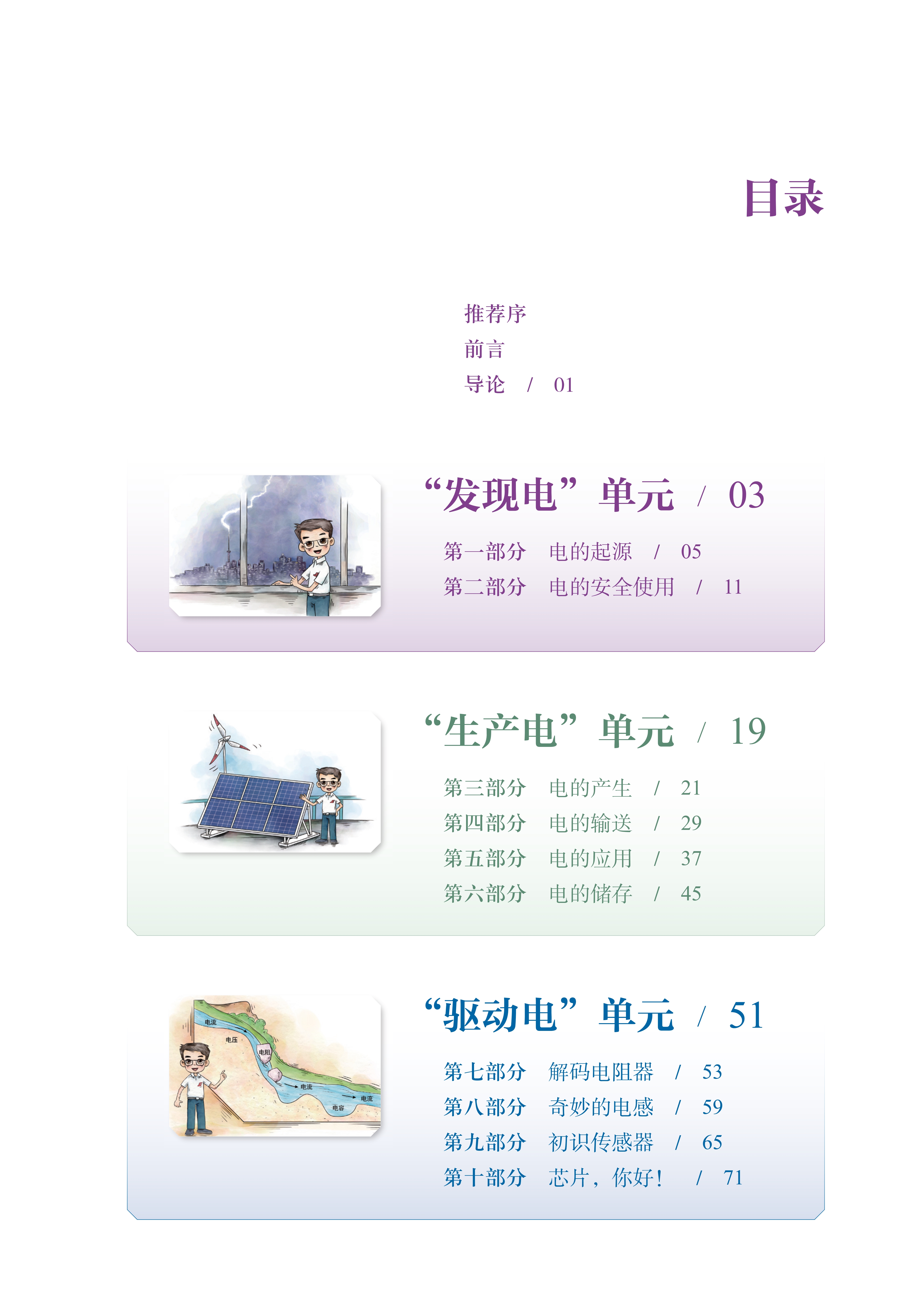 本书的实验器材侧重选取乡村生活日常用品,紧密结合乡村环境和生产实践活动,特别注意选取农村生活和社会中的科学现象作为实验内容 , 用心挖掘学生身边的学习资源,使之为课程教学服务,弥补乡村基础教育软硬件条件的不足。本书主要分为三个单元,“发现电”单元包括电的起源、电的安全使用,“生产电”单元包括电的产生、电的输送、电的应用、电的储存,“驱动电”单元包括解码电阻器、奇妙的电感、初识传感器、芯片等。本书将枯燥的电子设计课程知识,由学问渊博的电子“小博士”引导,以场景故事引入,引起学生学习兴趣,集知识性与趣味性于一体,开启电子世界的畅想之旅。