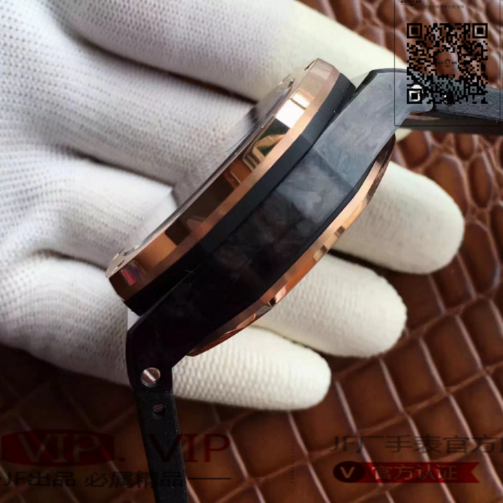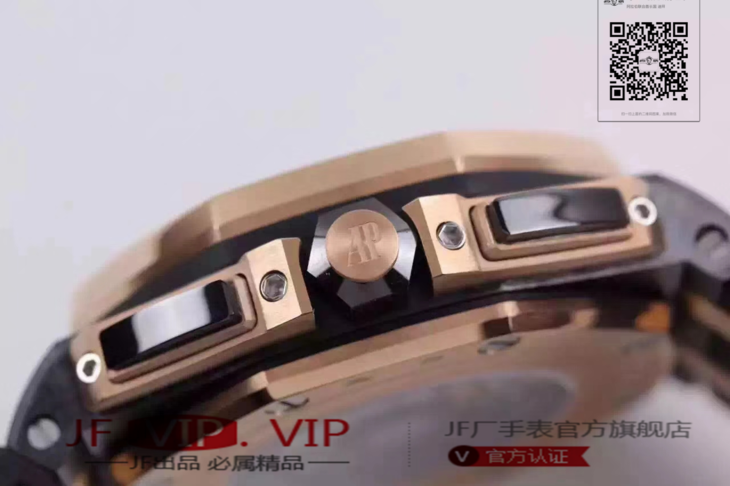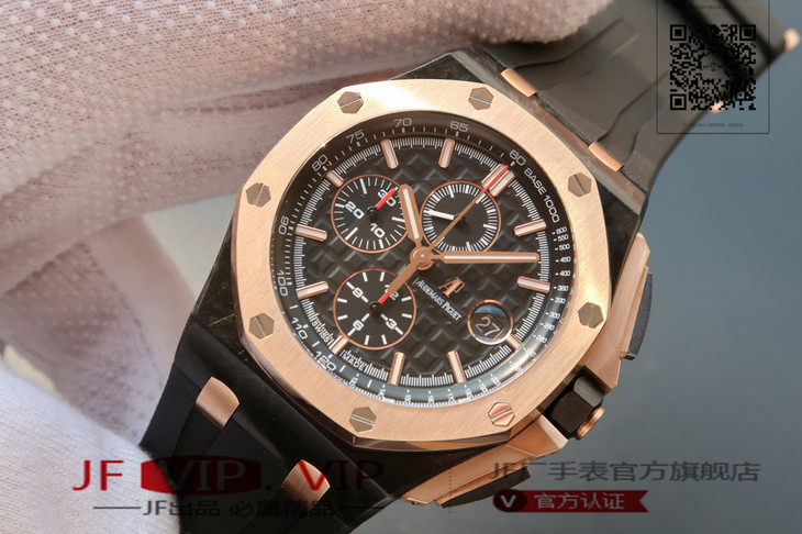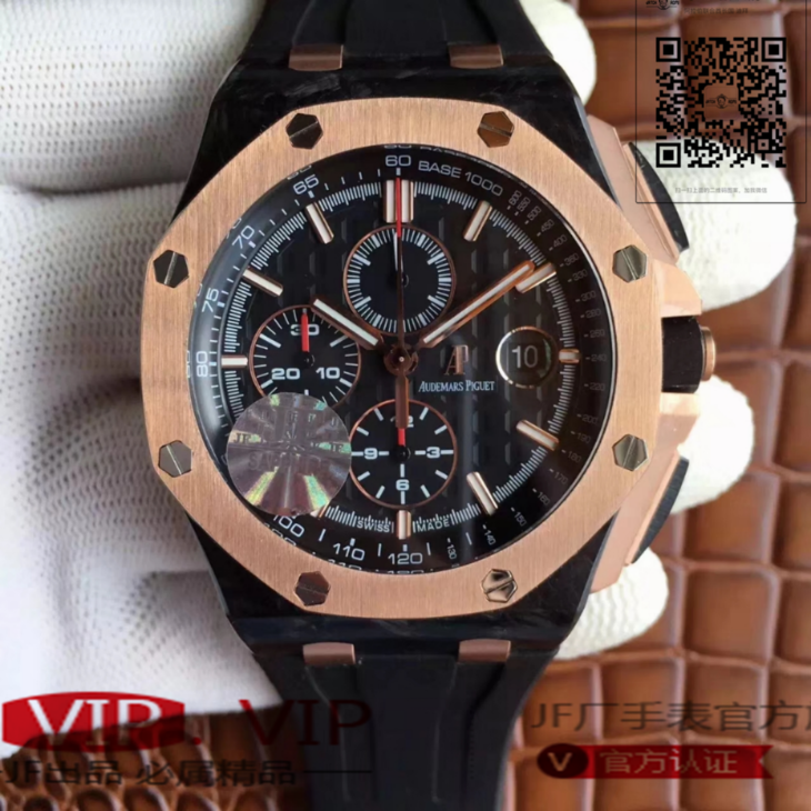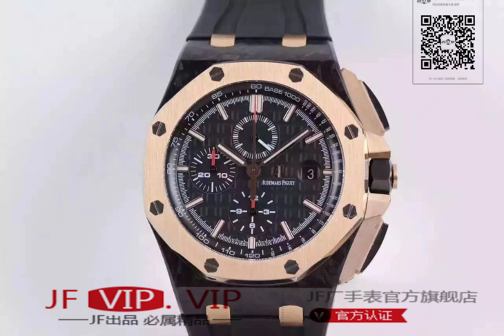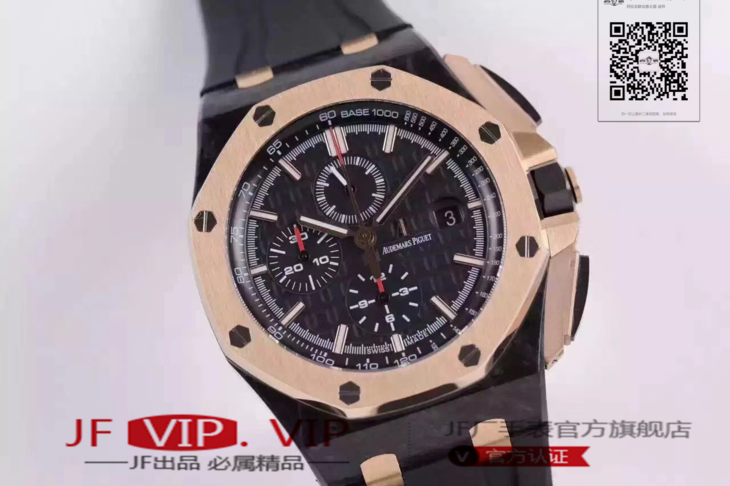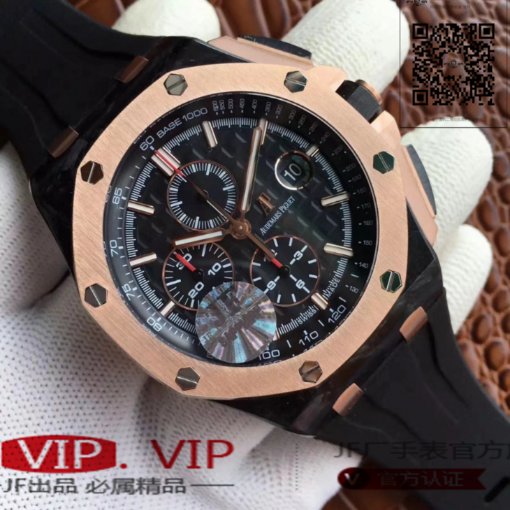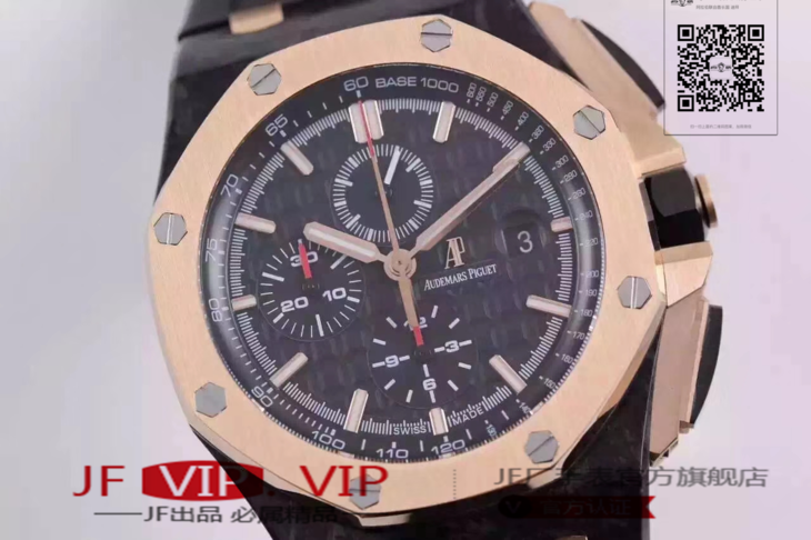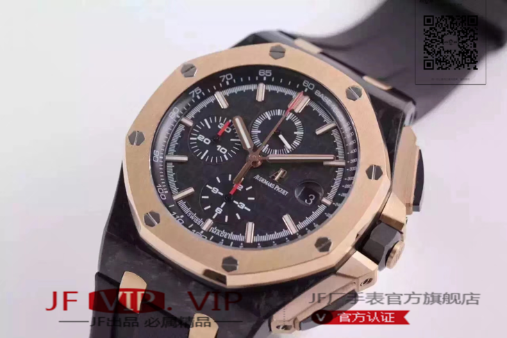 爱彼26406FR.OO.A002CA.01。 系列:皇家橡树离岸型 款式:原装开模cal.3126自动机械,44毫米,男士 材料:锻造碳纤维加包玫瑰金金表圈 振频:28800每小时振荡次数