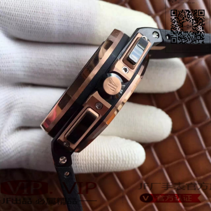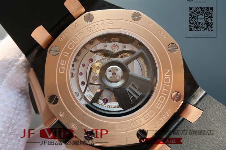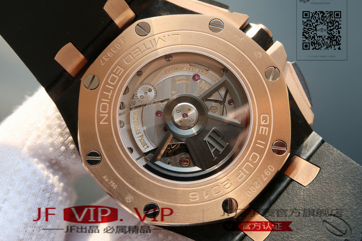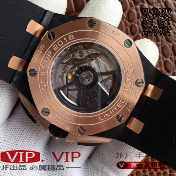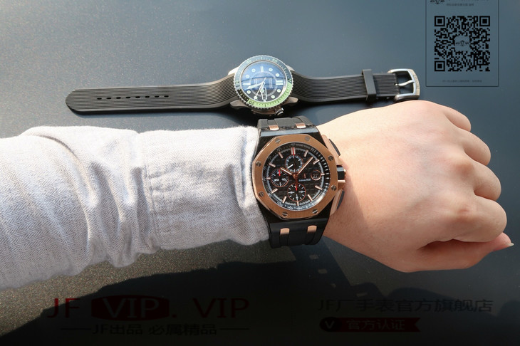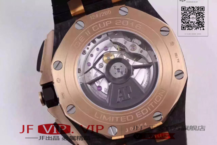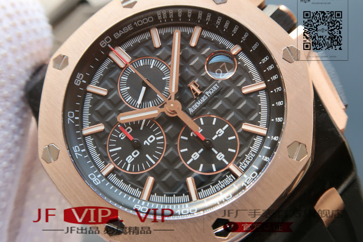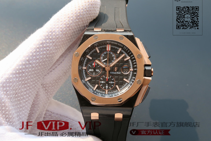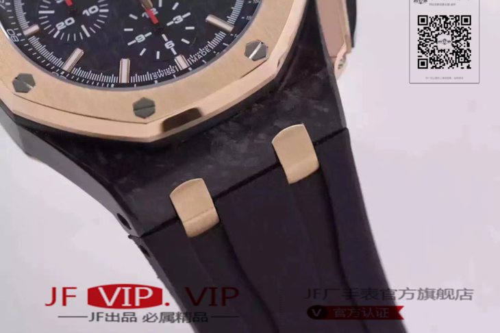 爱彼26406FR.OO.A002CA.01。 系列:皇家橡树离岸型 款式:原装开模cal.3126自动机械,44毫米,男士 材料:锻造碳纤维加包玫瑰金金表圈 振频:28800每小时振荡次数