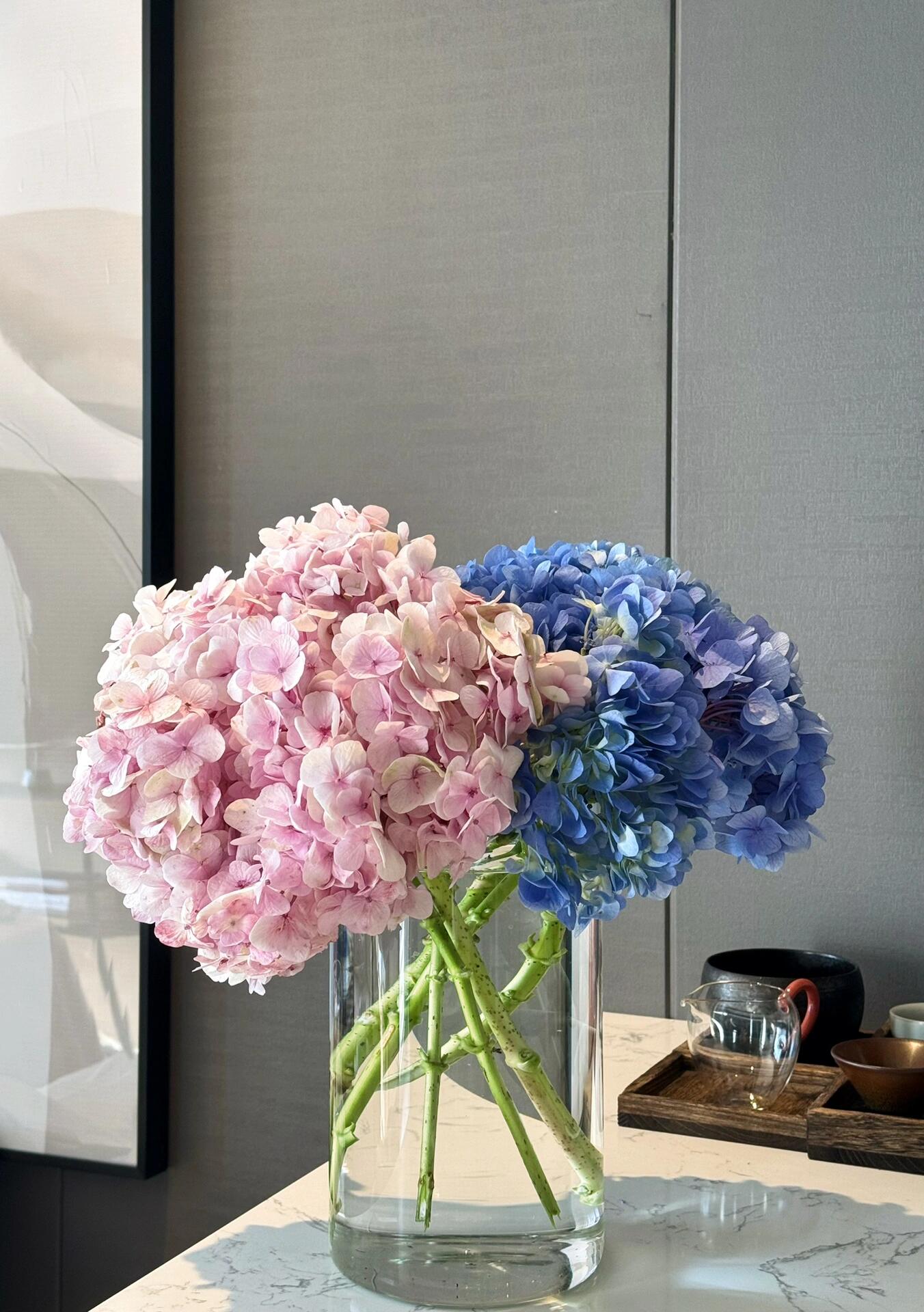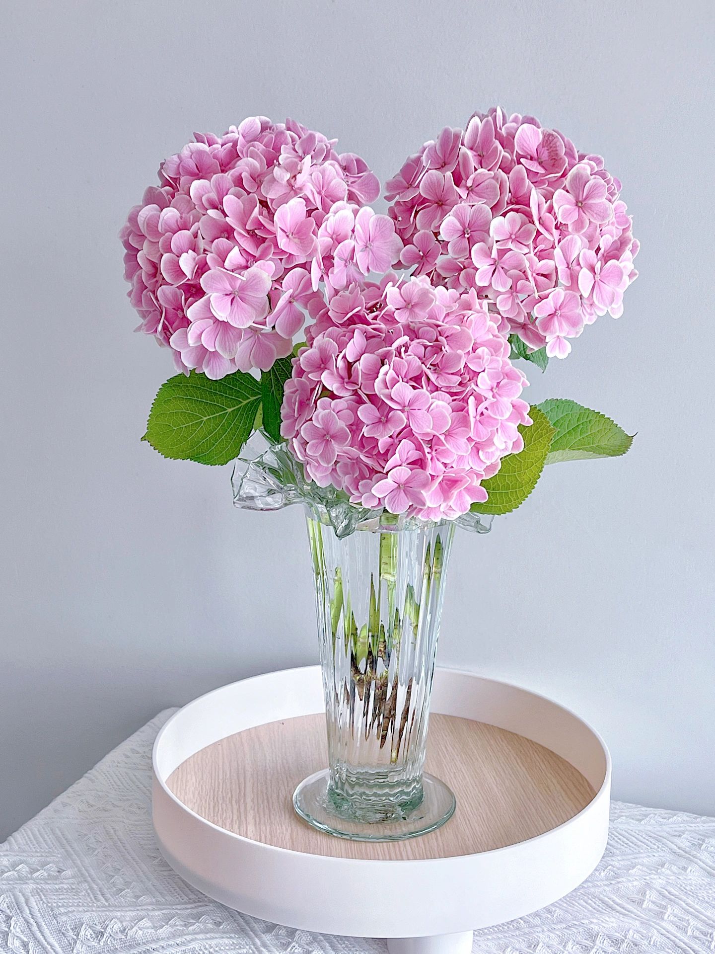 4.换水要勤快,木绣球根茎容易浑水,一般两天换一次水,换的时候把杆上粘液也要冲干净,隔两次还记得剪根。