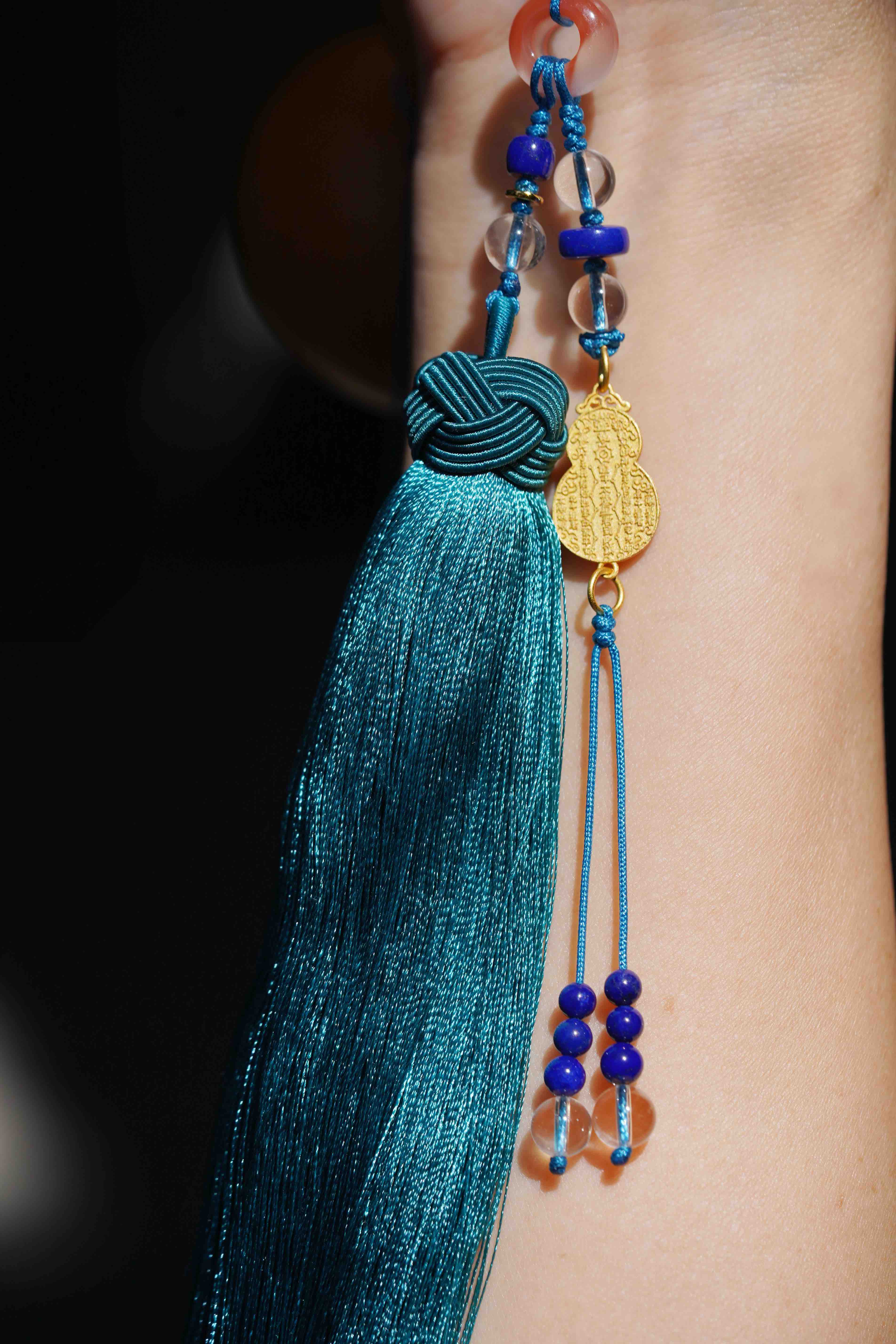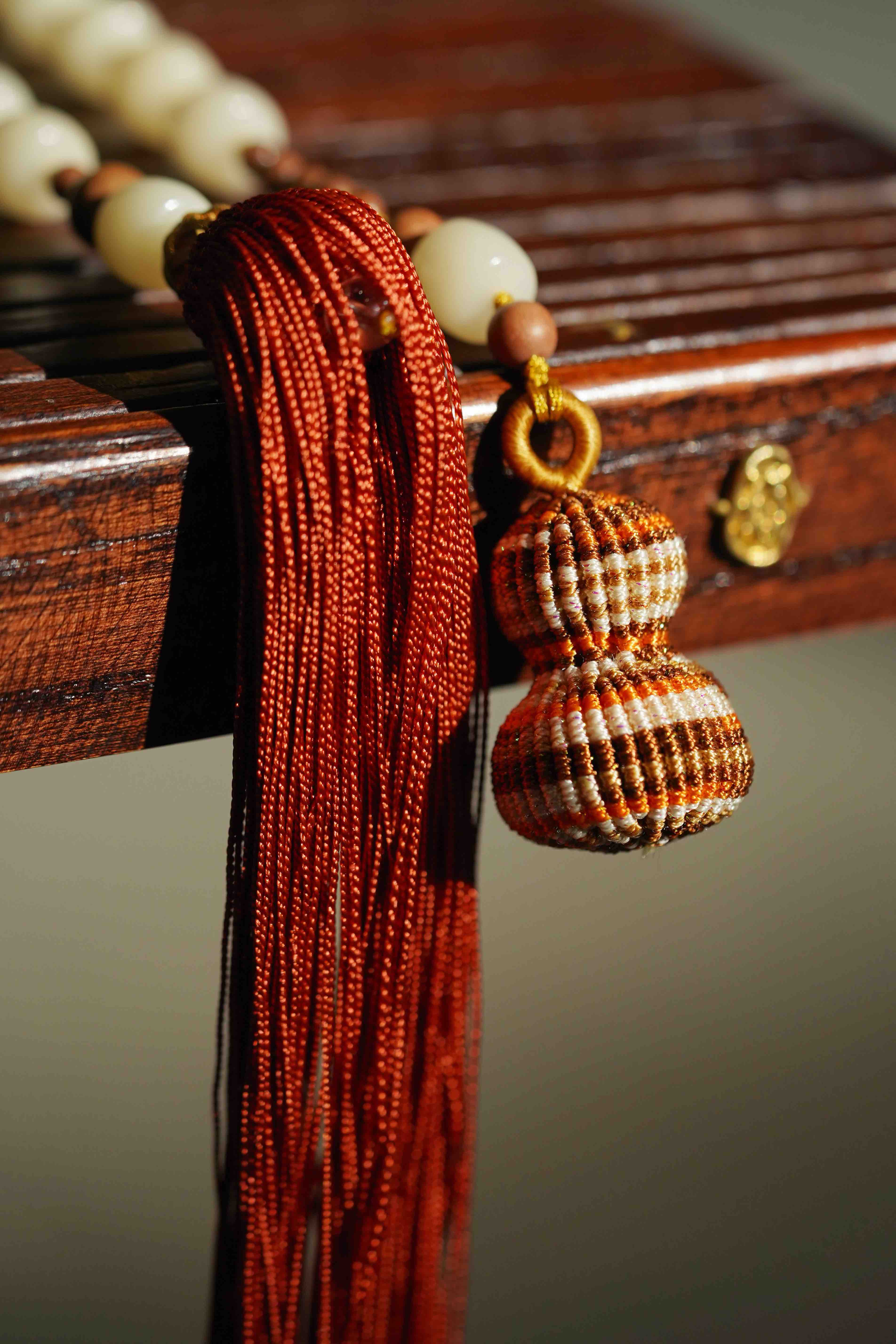 我们用真丝流苏,手工打磨的菩提根和老山檀搭配。这里必须强调,这个白菩提非常美,和市面上便宜那种都不同,有一种和田玉的质感。