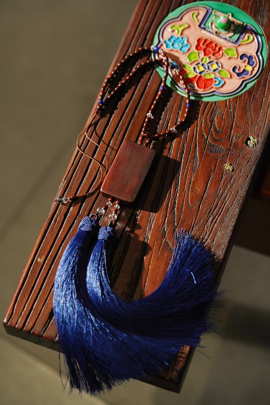 由小叶紫檀珠衔接真丝流苏
