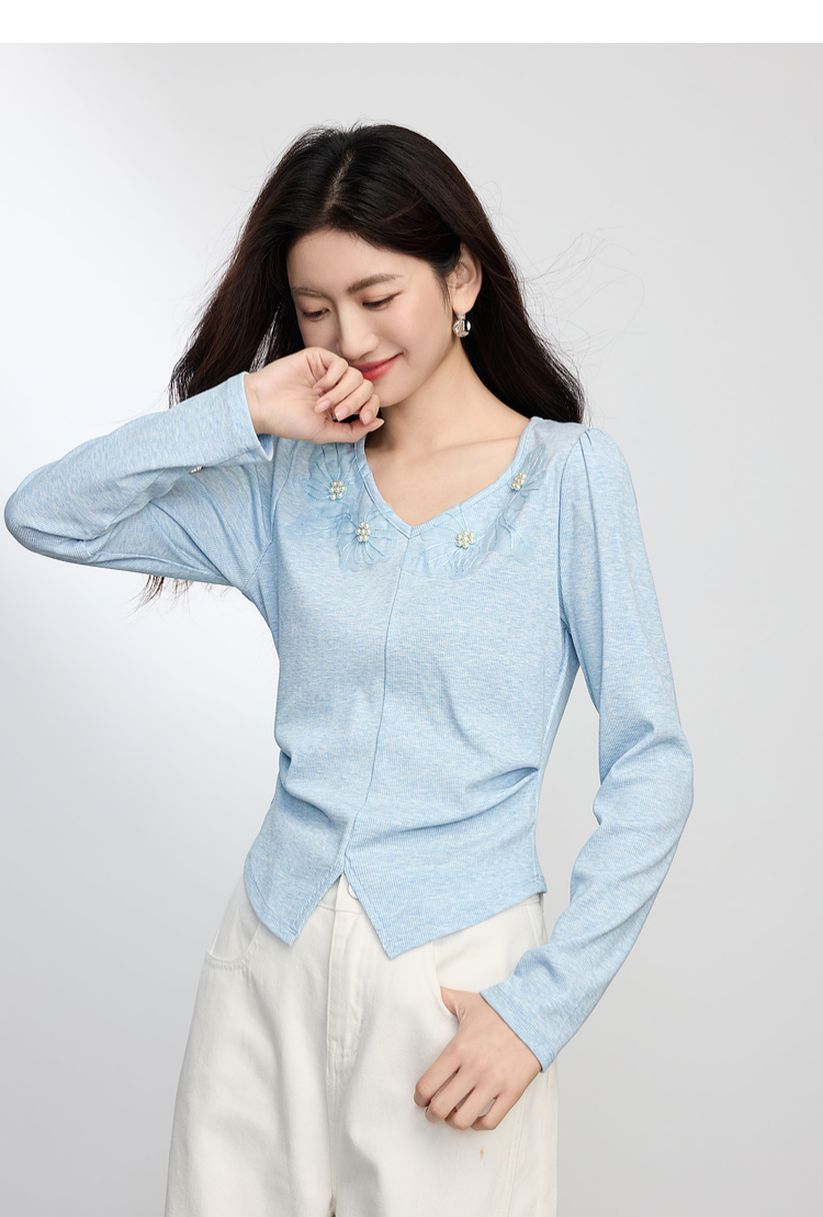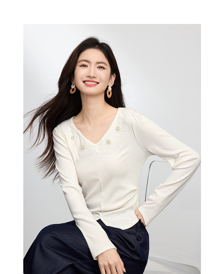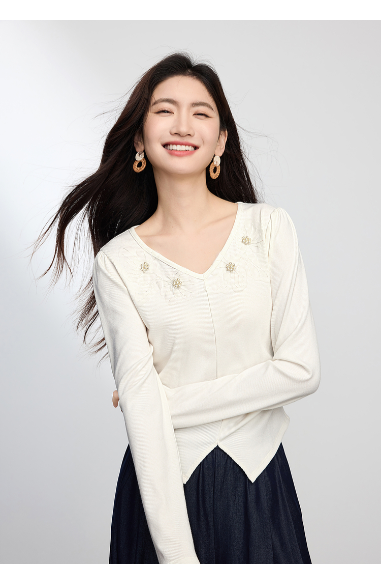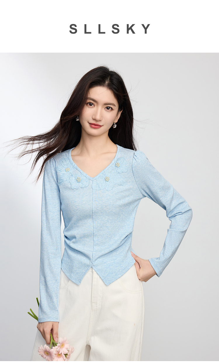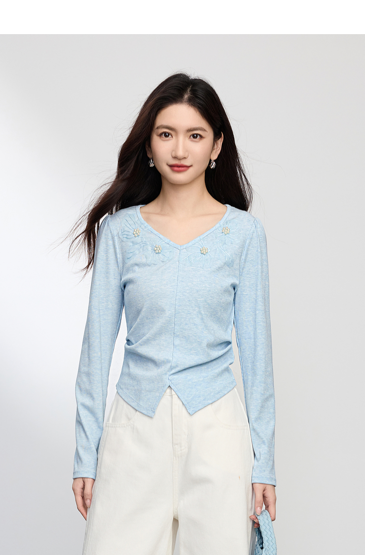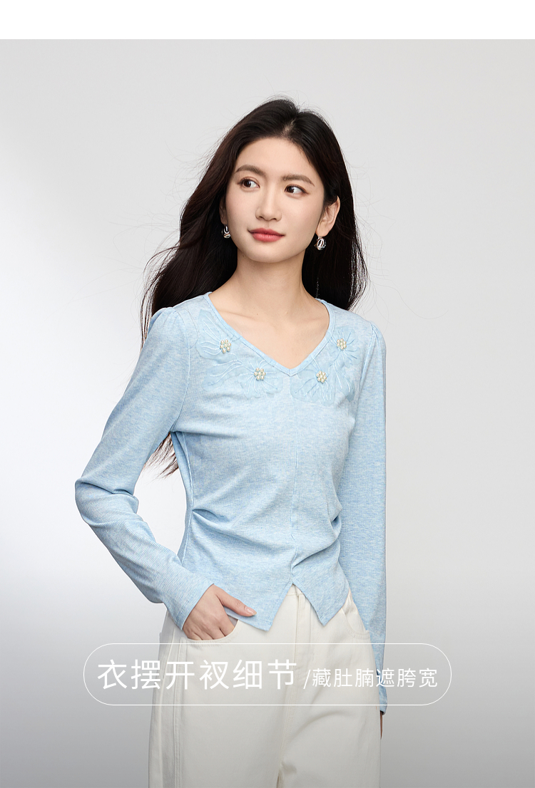 【周末秒杀】熙世界钉珠立体花朵V领T恤女长袖秋季新款设计感开叉正肩收腰上衣