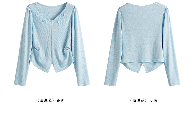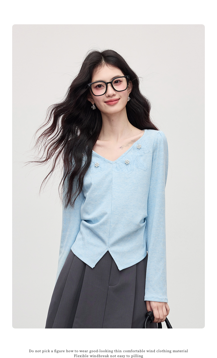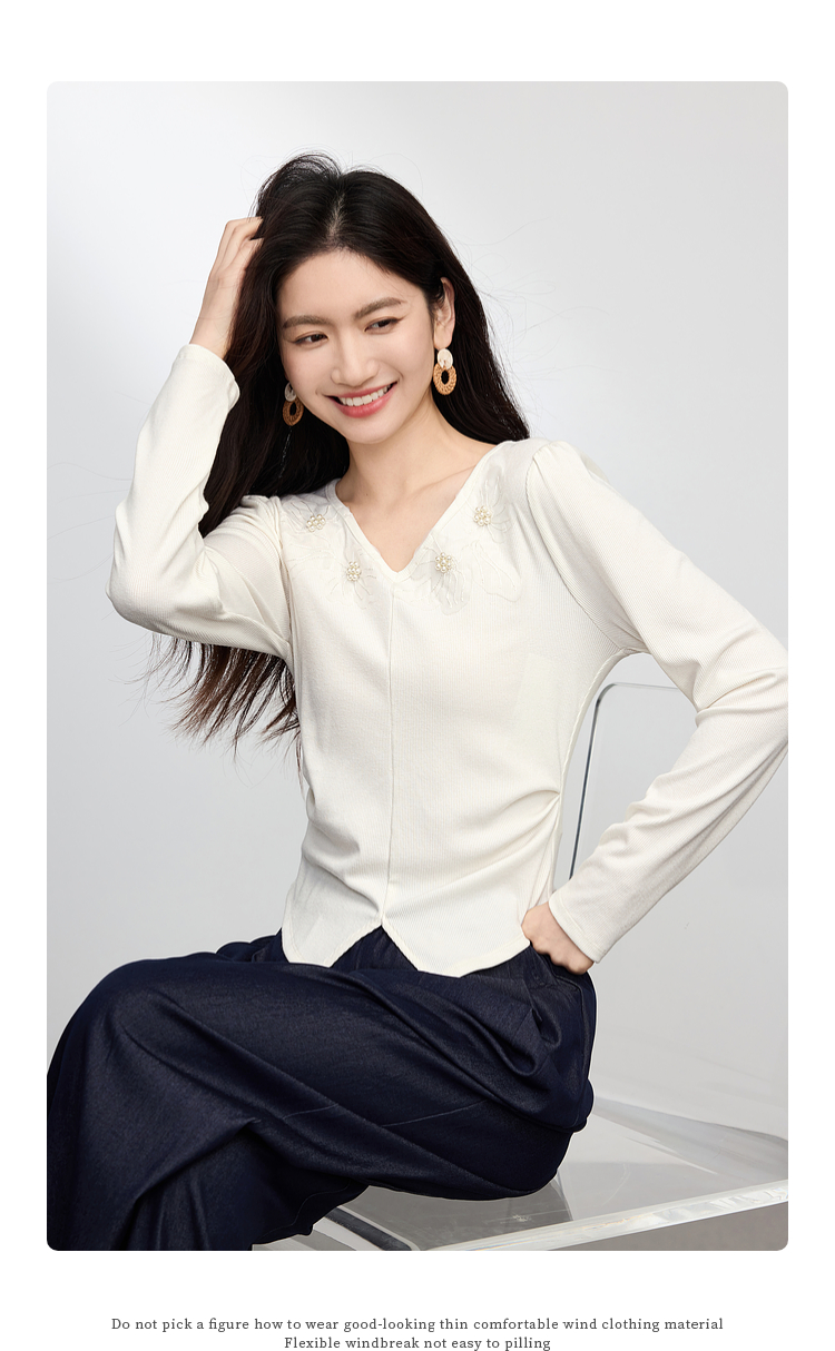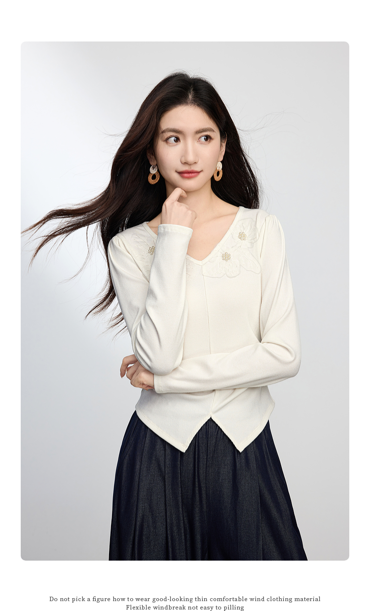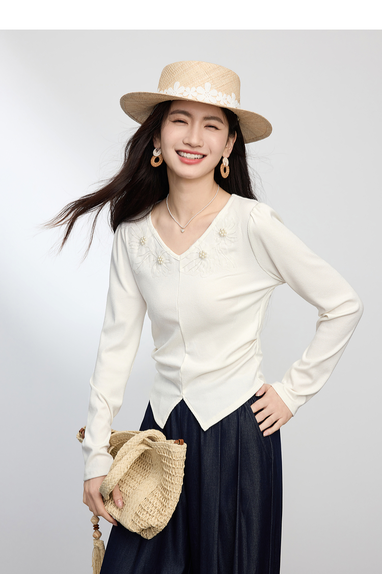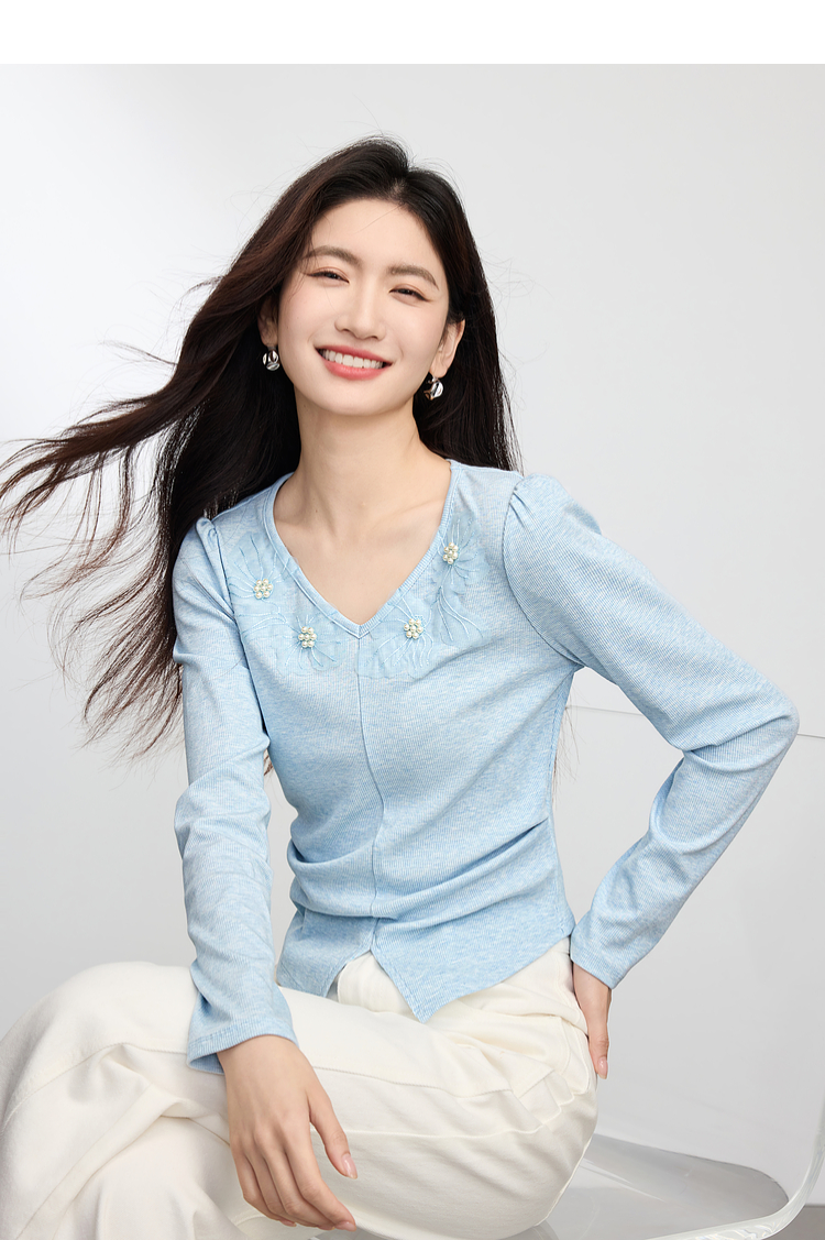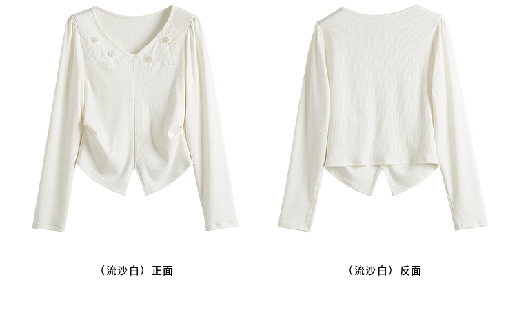 【周末秒杀】熙世界钉珠立体花朵V领T恤女长袖秋季新款设计感开叉正肩收腰上衣