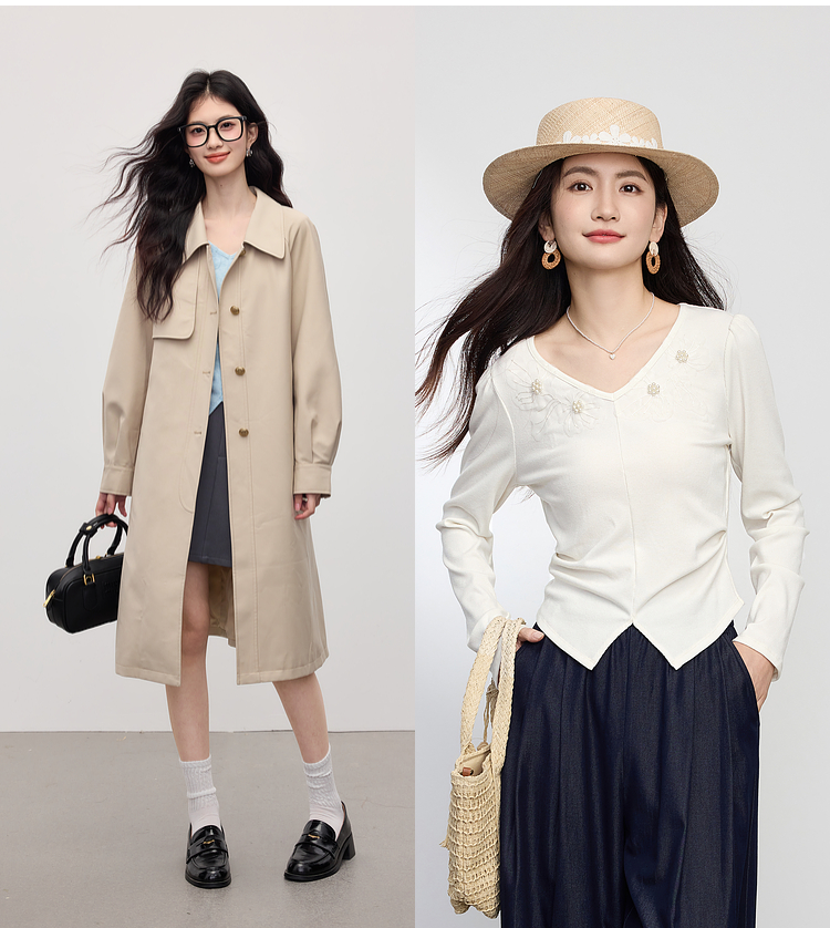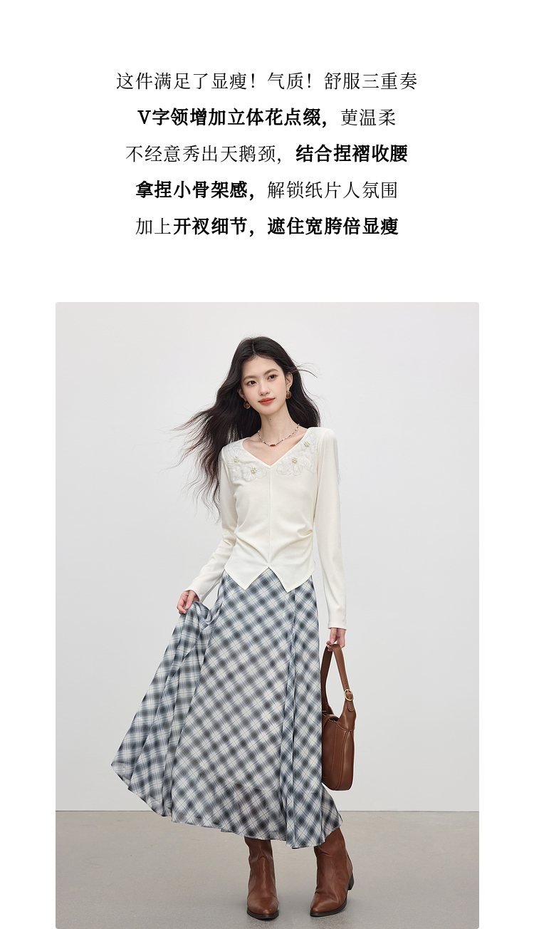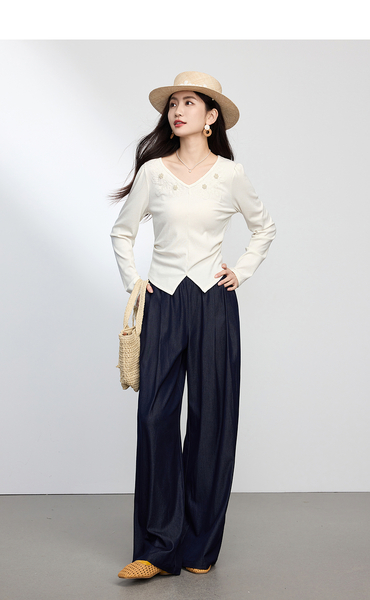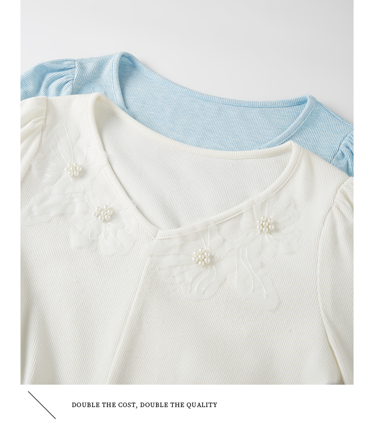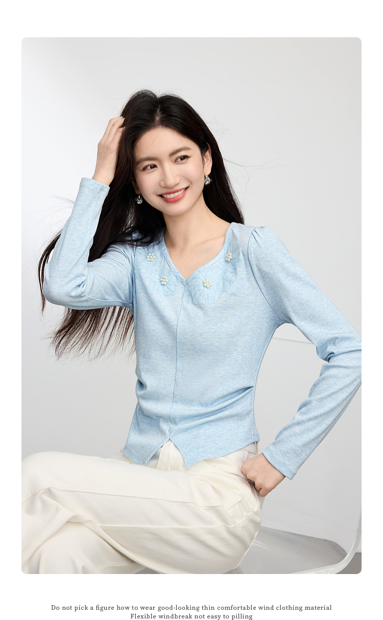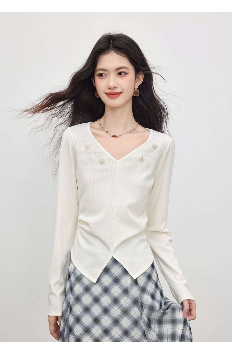 【周末秒杀】熙世界钉珠立体花朵V领T恤女长袖秋季新款设计感开叉正肩收腰上衣