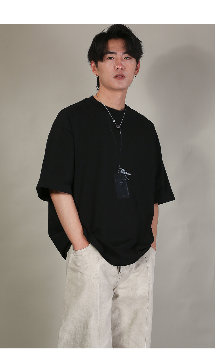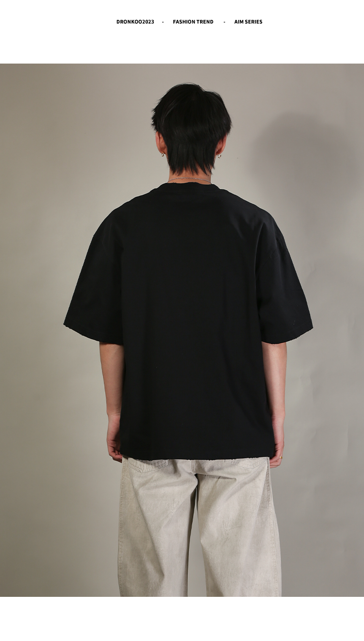 DRONKOO 2026 圆领前R刺绣肩毛边短袖T恤