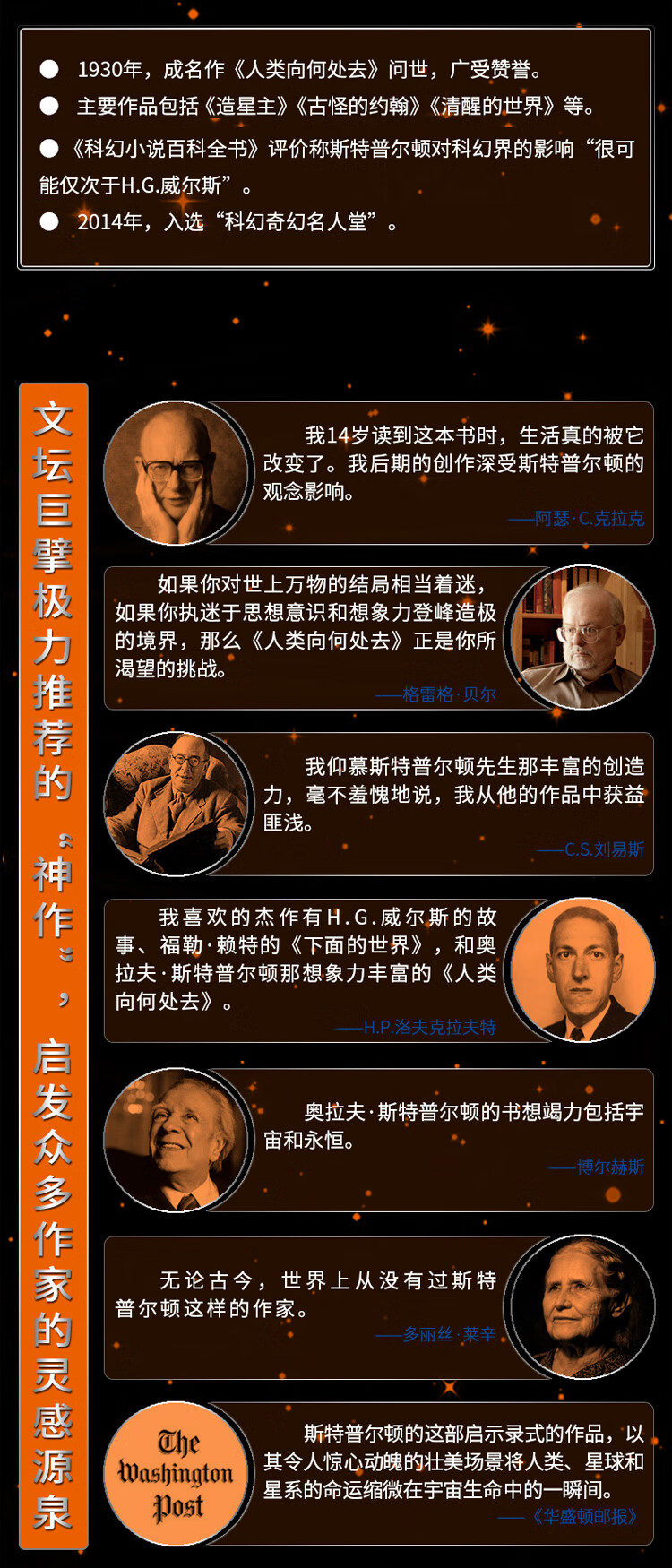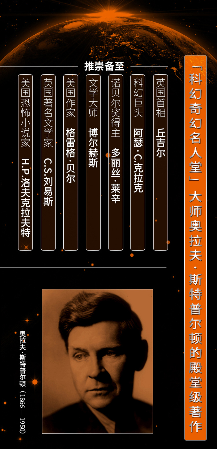 迄今为止,还从未有过像斯特普尔顿这样的作家。他的作品被贴上了科幻小说、太空小说、纪实文学的标签,但他的写作生涯比这些人为分类的出现都要早。他一定会觉得这种划分极其可笑。他超越了这些风格的界限。读他的作品意味着,你要从短暂的、世俗的心态跃向一个超越当下时空概念的领域,未来人类的领域,一片我们作为一个物种尚未踏入的领域。