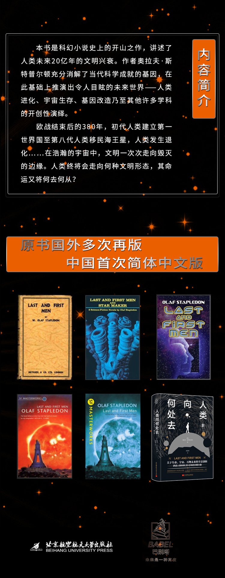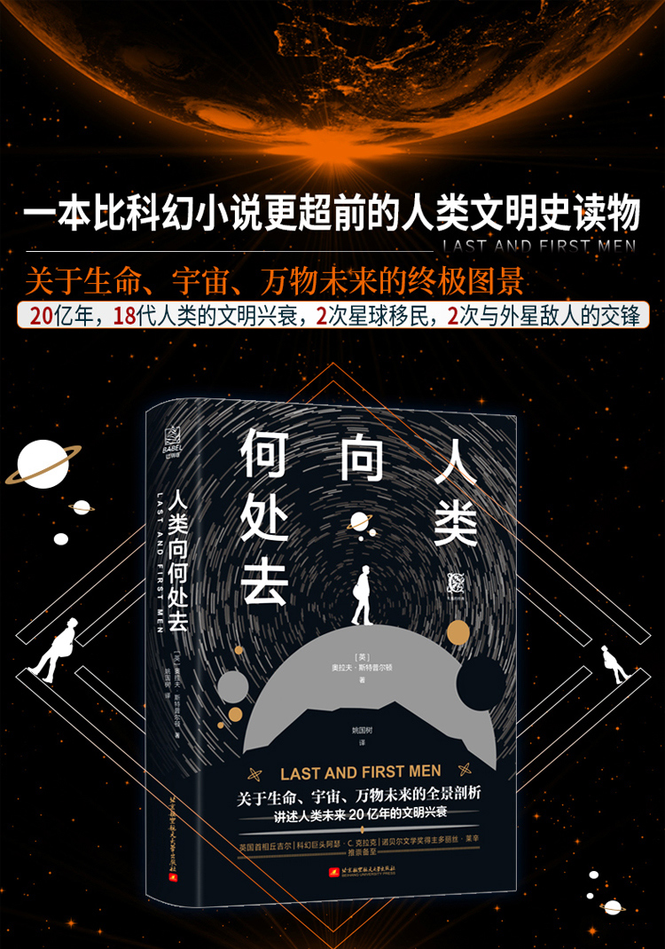本书是科幻小说史上的开山之作,讲述了人类未来20亿年的文明兴衰。作者奥拉夫斯特普尔顿充分消解了当代科学成就的基因,在此基础上推演出令人目眩的未来世界——人类进化、宇宙生存、基因改造乃至其他许多学科的开创性演绎。