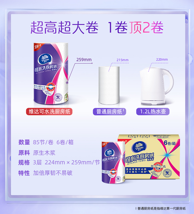 维达可水洗厨房纸3层85节6卷装 KO七大油污 告别污渍烦恼 48小时发货