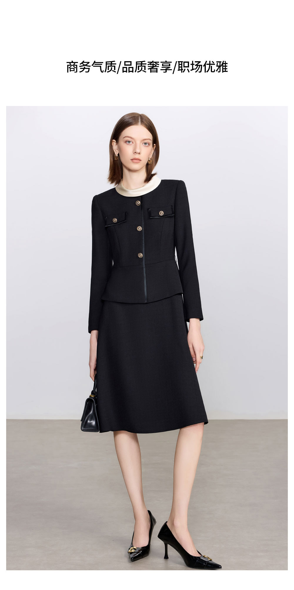 IWY/拼接领黑色假两件连衣裙女秋季新款法式优雅气质职业装Q1448
