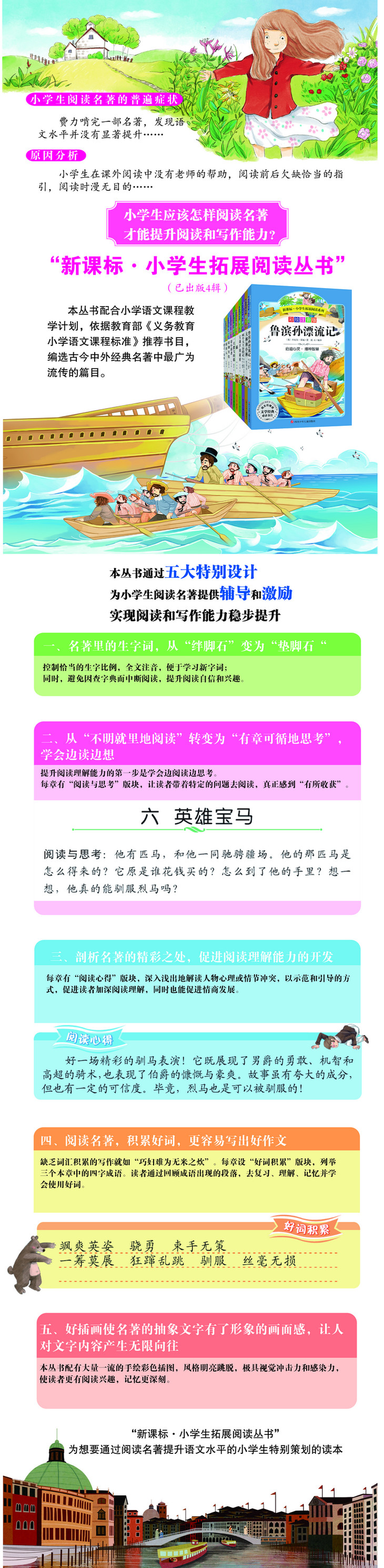将原著进行适当改编,降低阅读难度,保留原著精髓;加注音,学习新字词,避免因查字典而中断阅读。