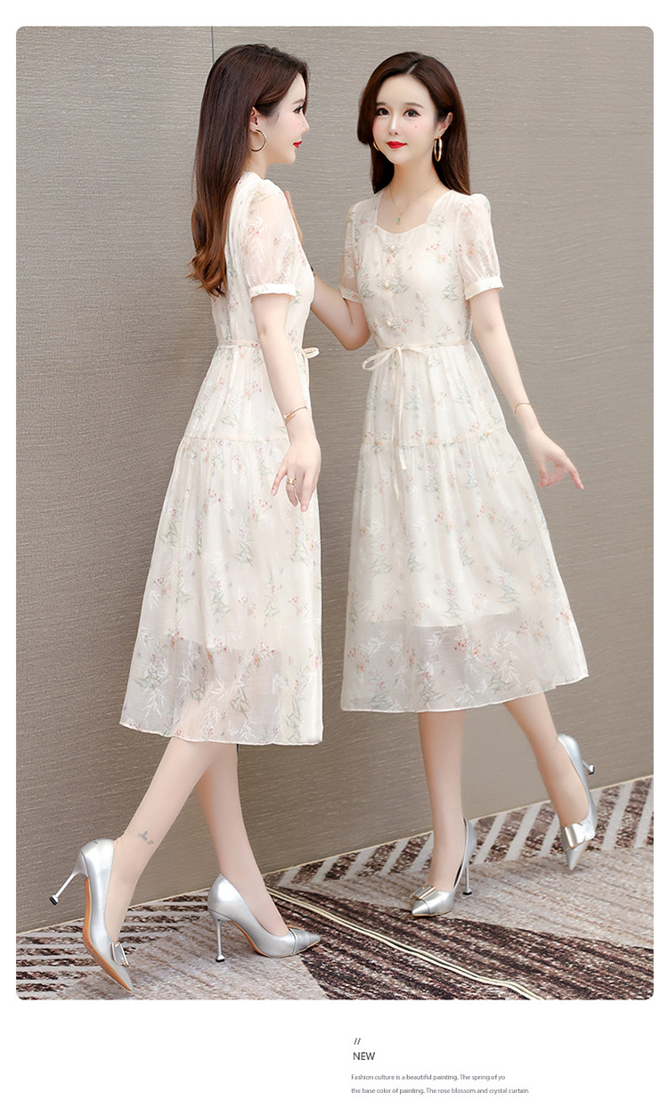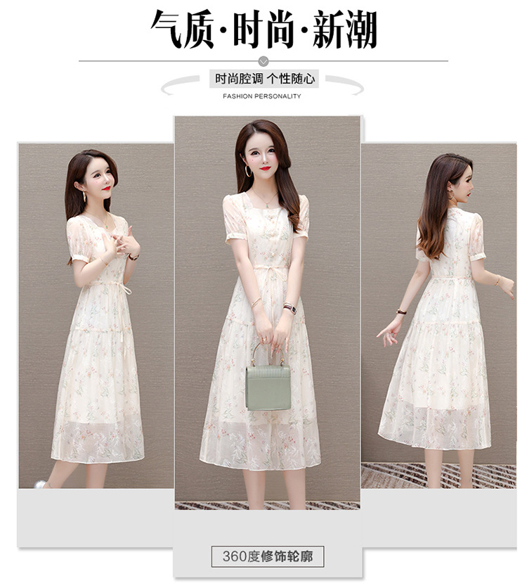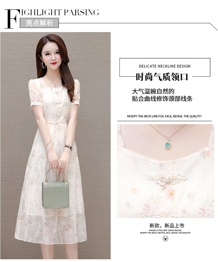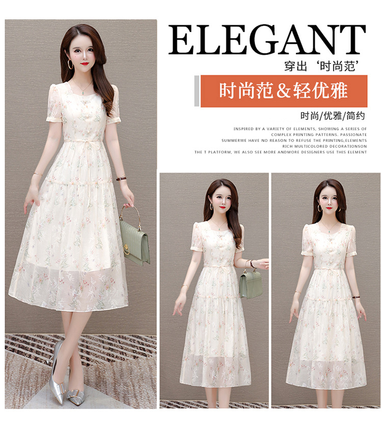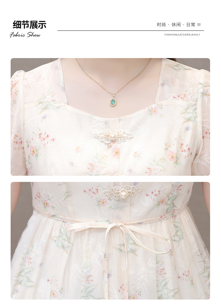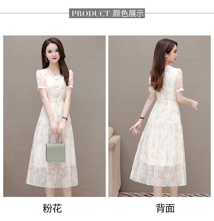碎花雪纺短袖连衣裙,系带收腰裙短袖中长裙QYM-LRX-NF888-1-Y