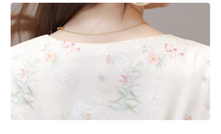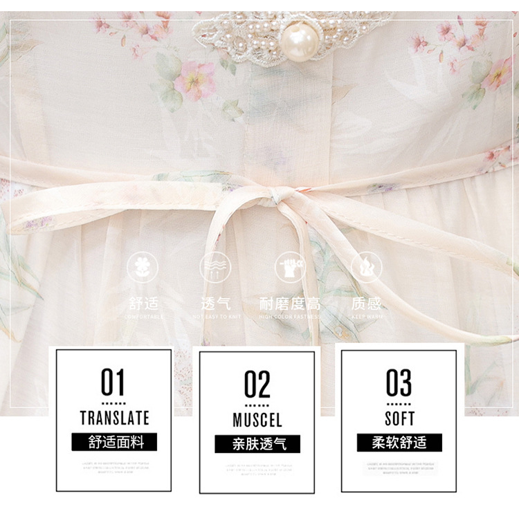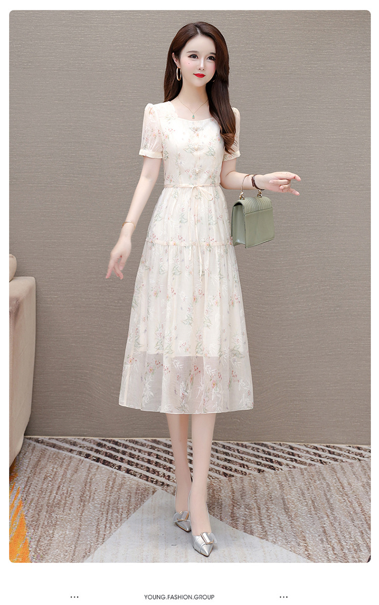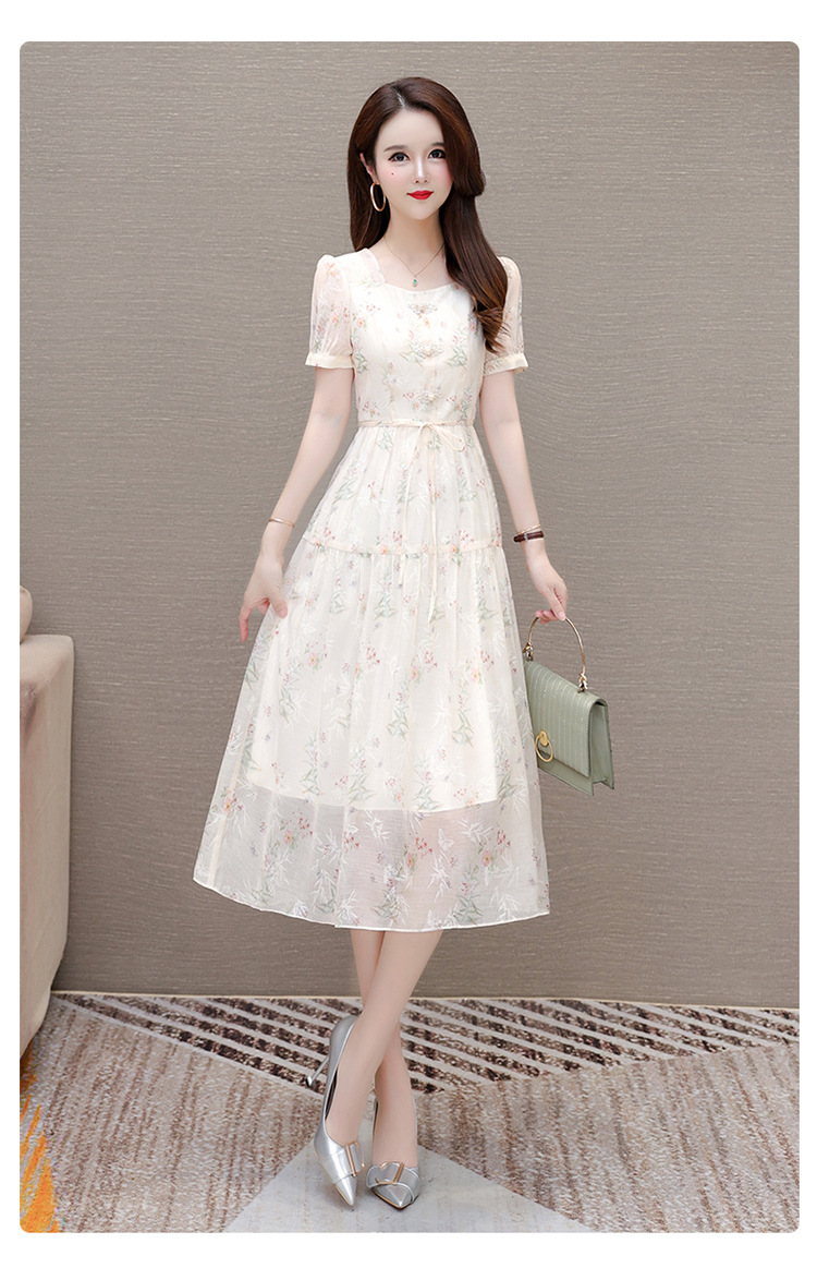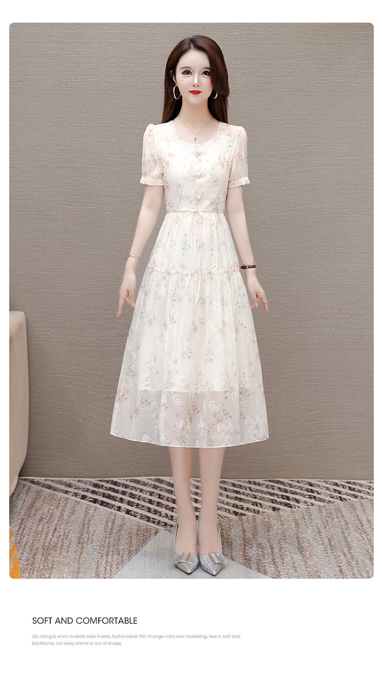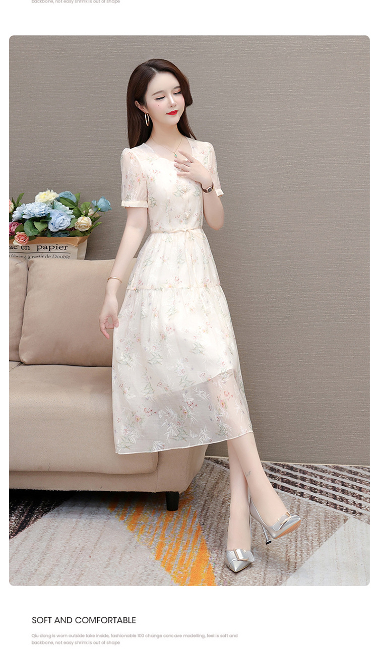 碎花雪纺短袖连衣裙,系带收腰裙短袖中长裙QYM-LRX-NF888-1-Y