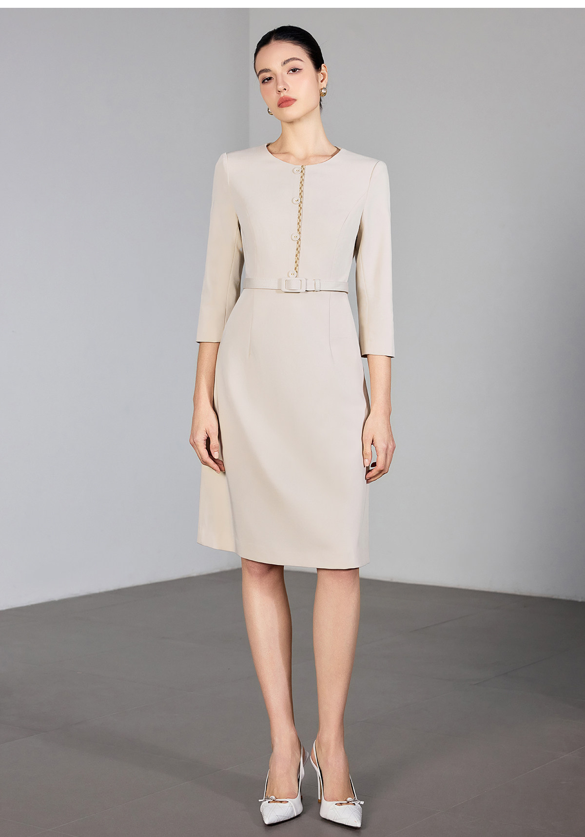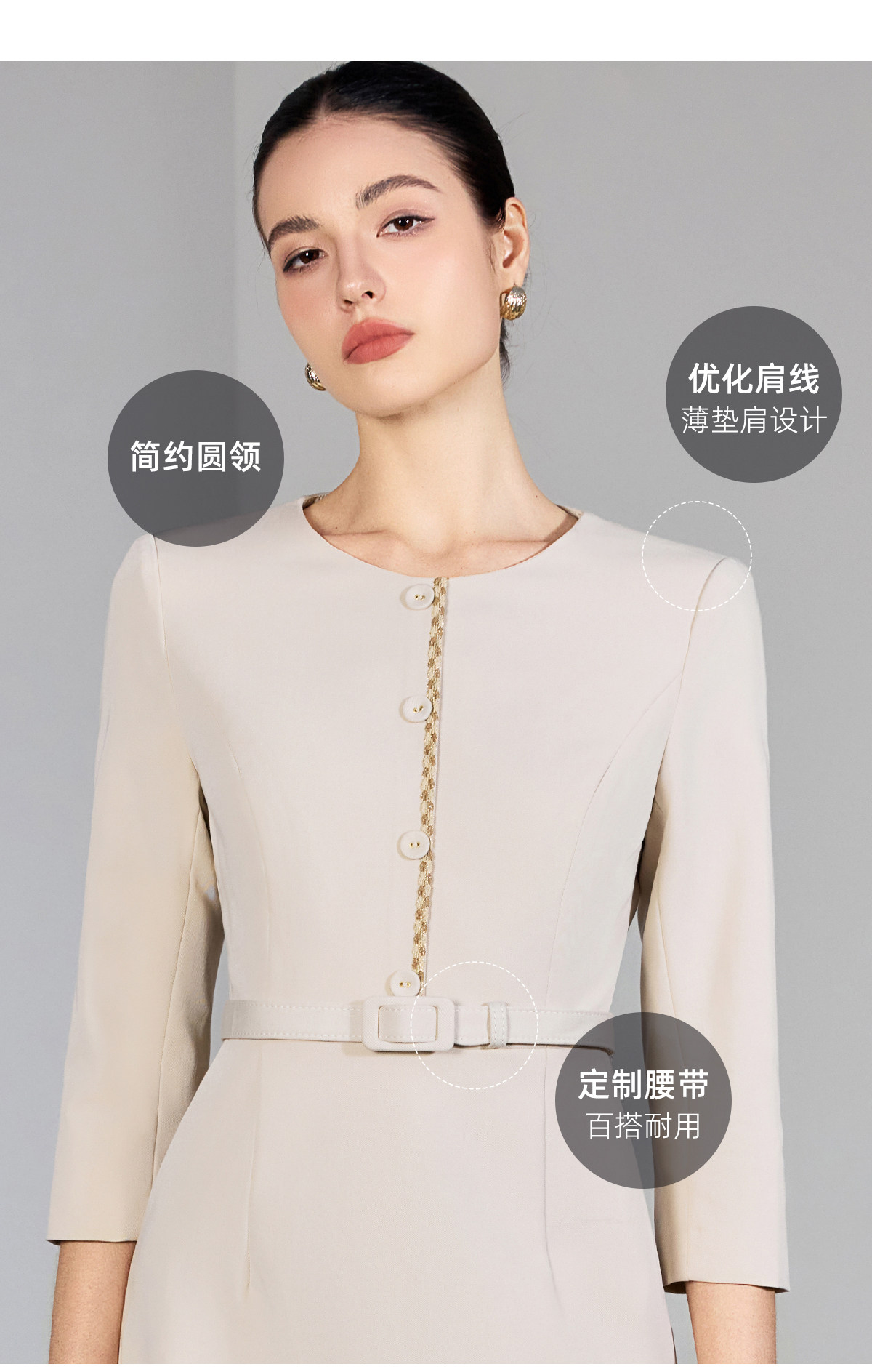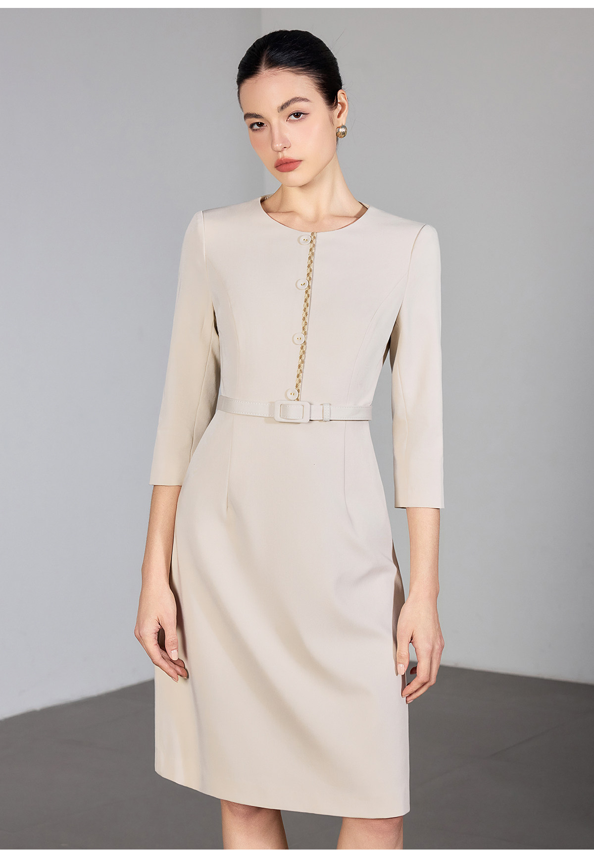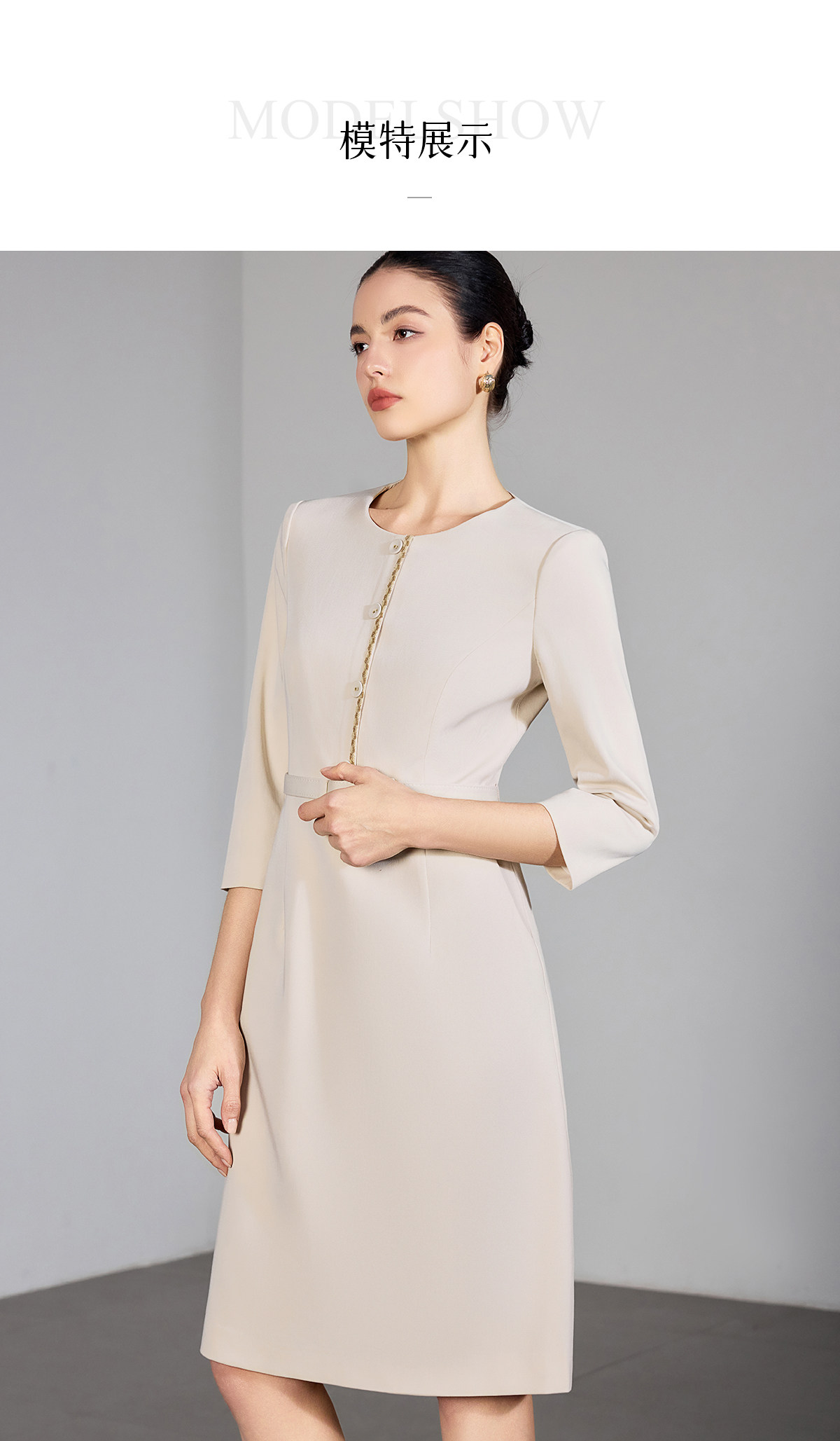 IWY/米色七分袖连衣裙女收腰显瘦职业裙装通勤干练美容院工作服25Q867