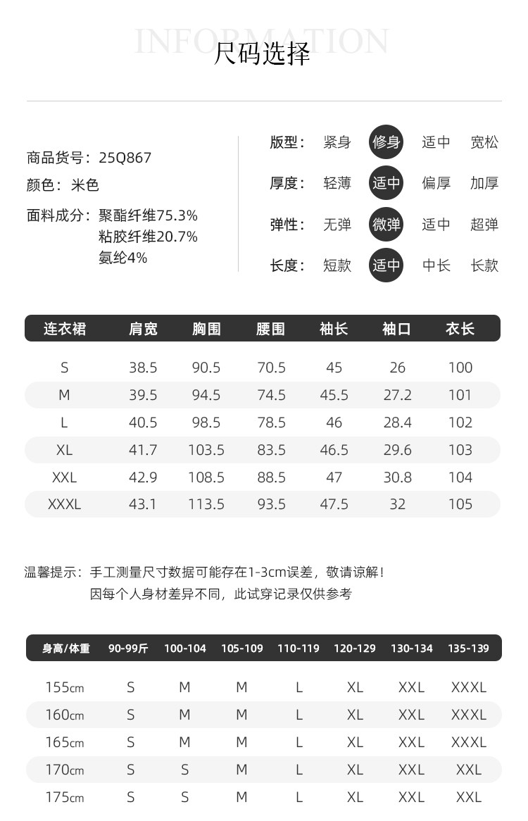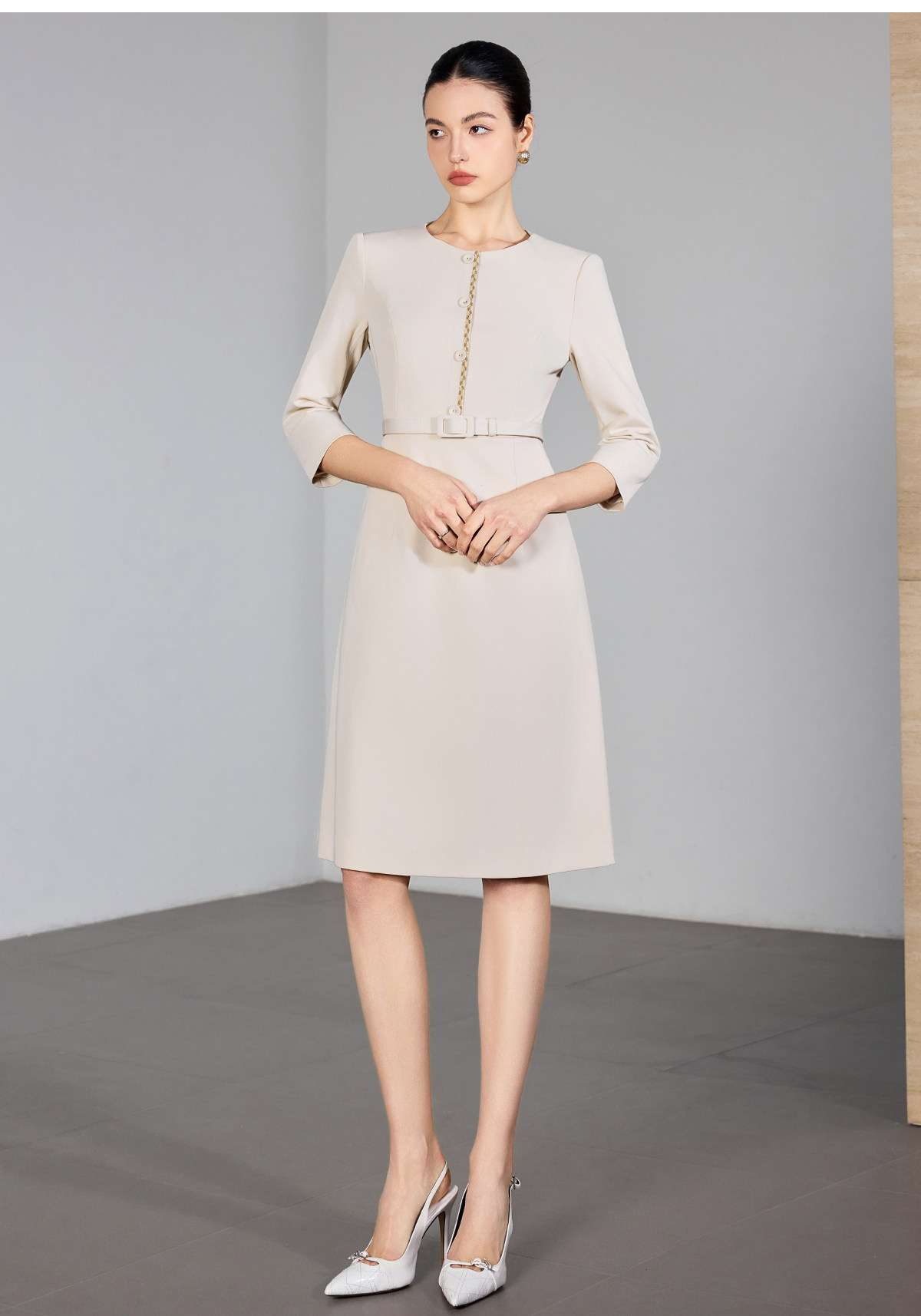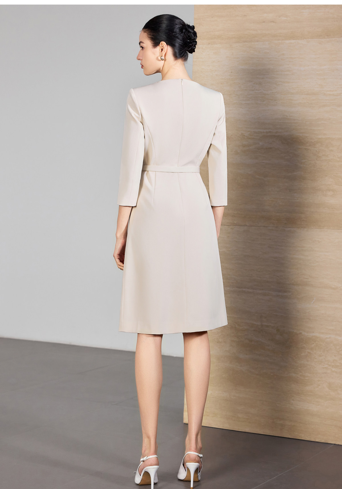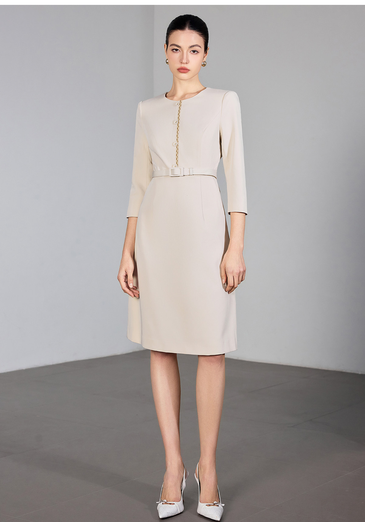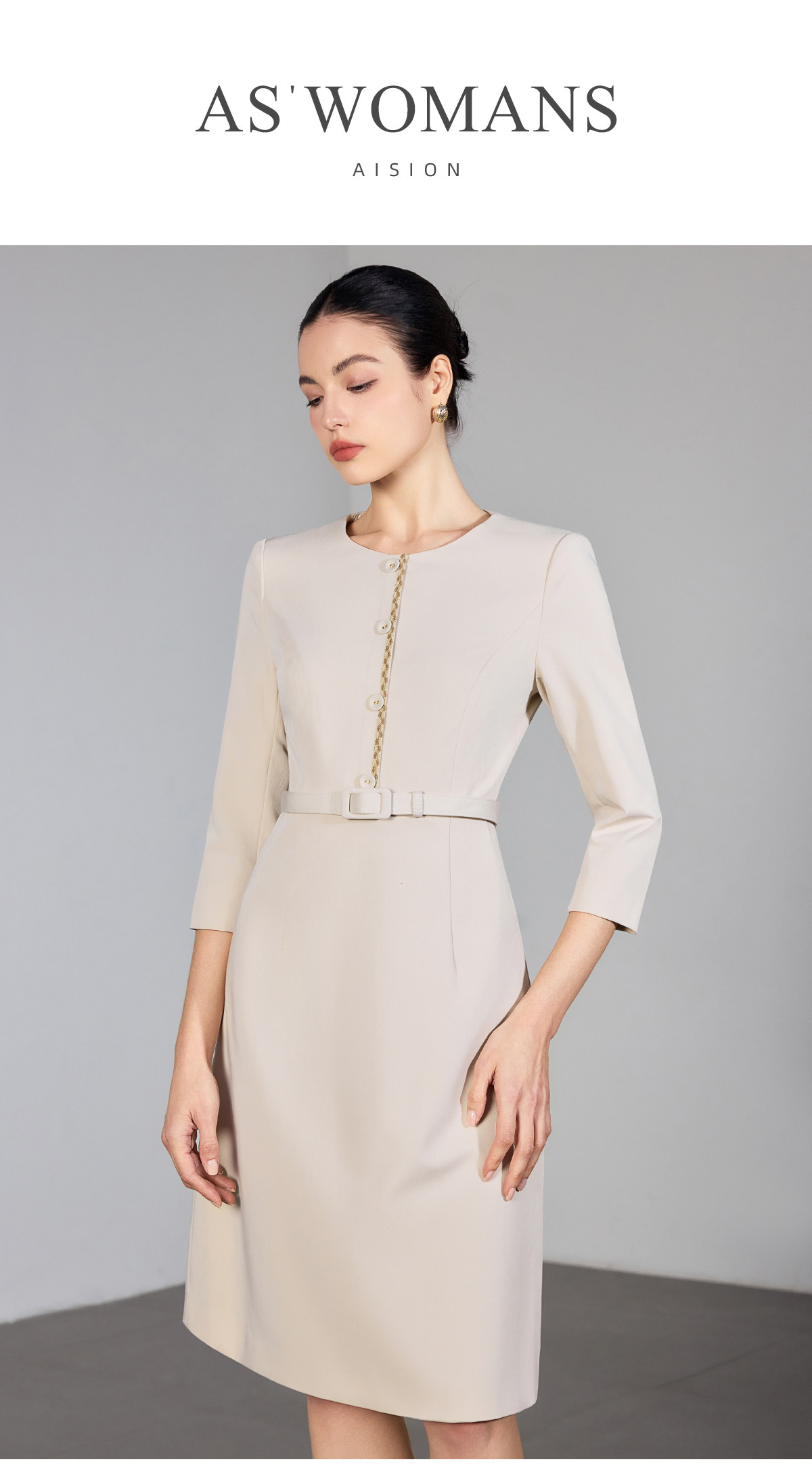 IWY/米色七分袖连衣裙女收腰显瘦职业裙装通勤干练美容院工作服25Q867
