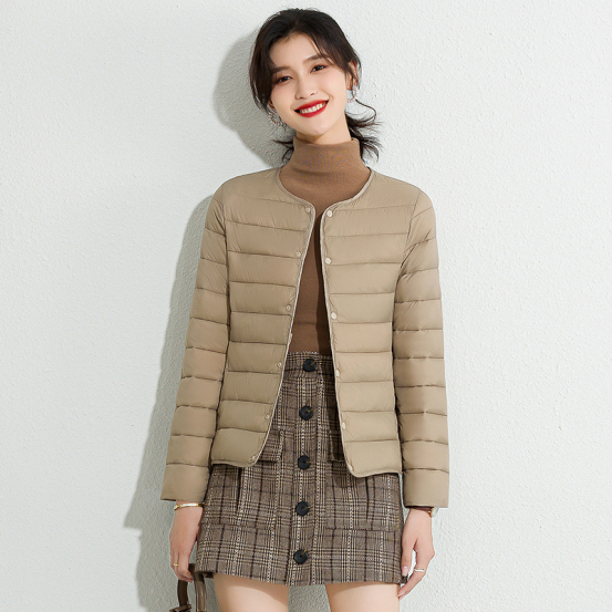 一衣两穿 圆领V领自由切换,轻松两步 1、解开第一颗、第二颗纽扣,将衣领内侧的纽扣与第一颗纽扣扣在一起。 2、将左右的衣领向内翻折至第三颗纽扣处,即可成为实用的内搭羽绒服。 可作为大衣的内搭