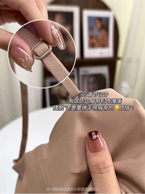 考虑细肩带容易绷劲崩线走光,特地挑选了加宽设计,缝合处做了密实的压线,牢固贴合不走光,同时可调节设计,有效防止肩带松垮滑落,摆脱“老是要伸手捞肩带的烦恼”!