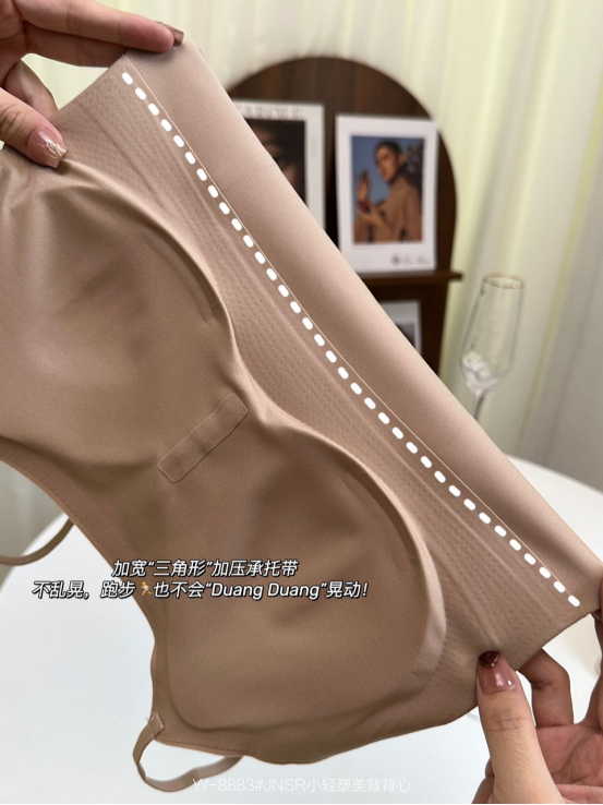它虽是无钢圈吊带,但在胸垫下摆设计了加宽“三角形”加压承托带,上面肩带往上提拉,下面加压带把胸型往上承托,不乱晃,跑步也不会“Duang Duang”晃动!